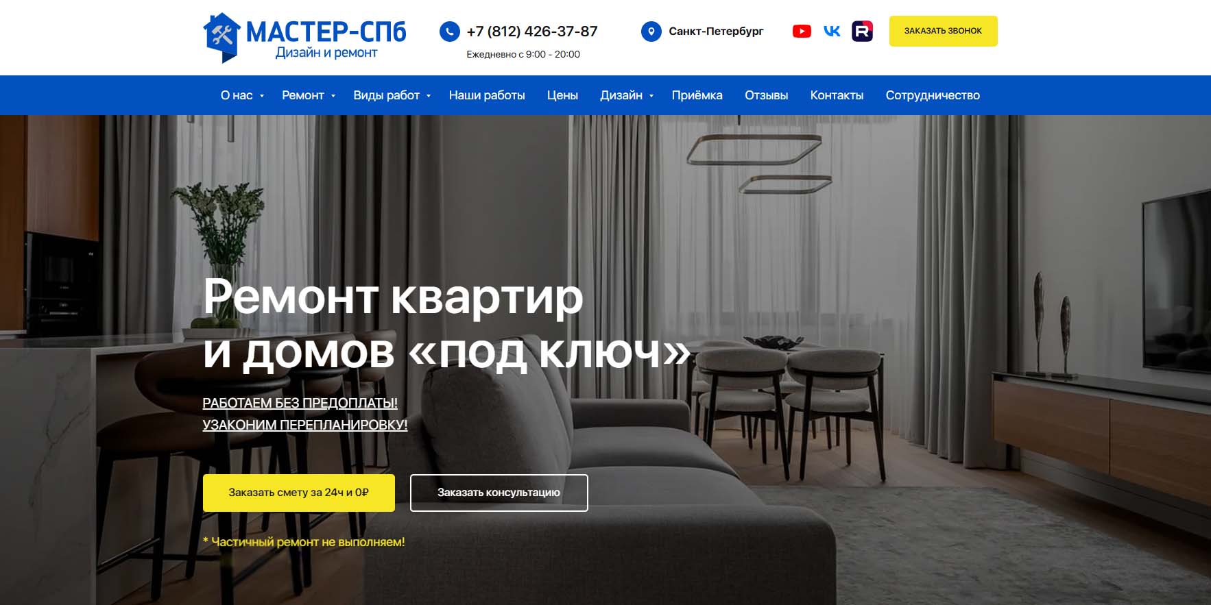 «Мастер СПб» начал работу в 2007 году. Сначала в компании работали двое братьев. Постепенно фирма росла и сейчас в ее штате более 60 человек — администраторы, специалисты по дизайну, прорабы, сантехники, электрики, маляры и другие рабочие. Гарантируют, что качественно выполнят ремонт любой сложности, сделают бесплатный замер и смету за 24 часа. Помогут с закупкой строительных и отделочных материалов.