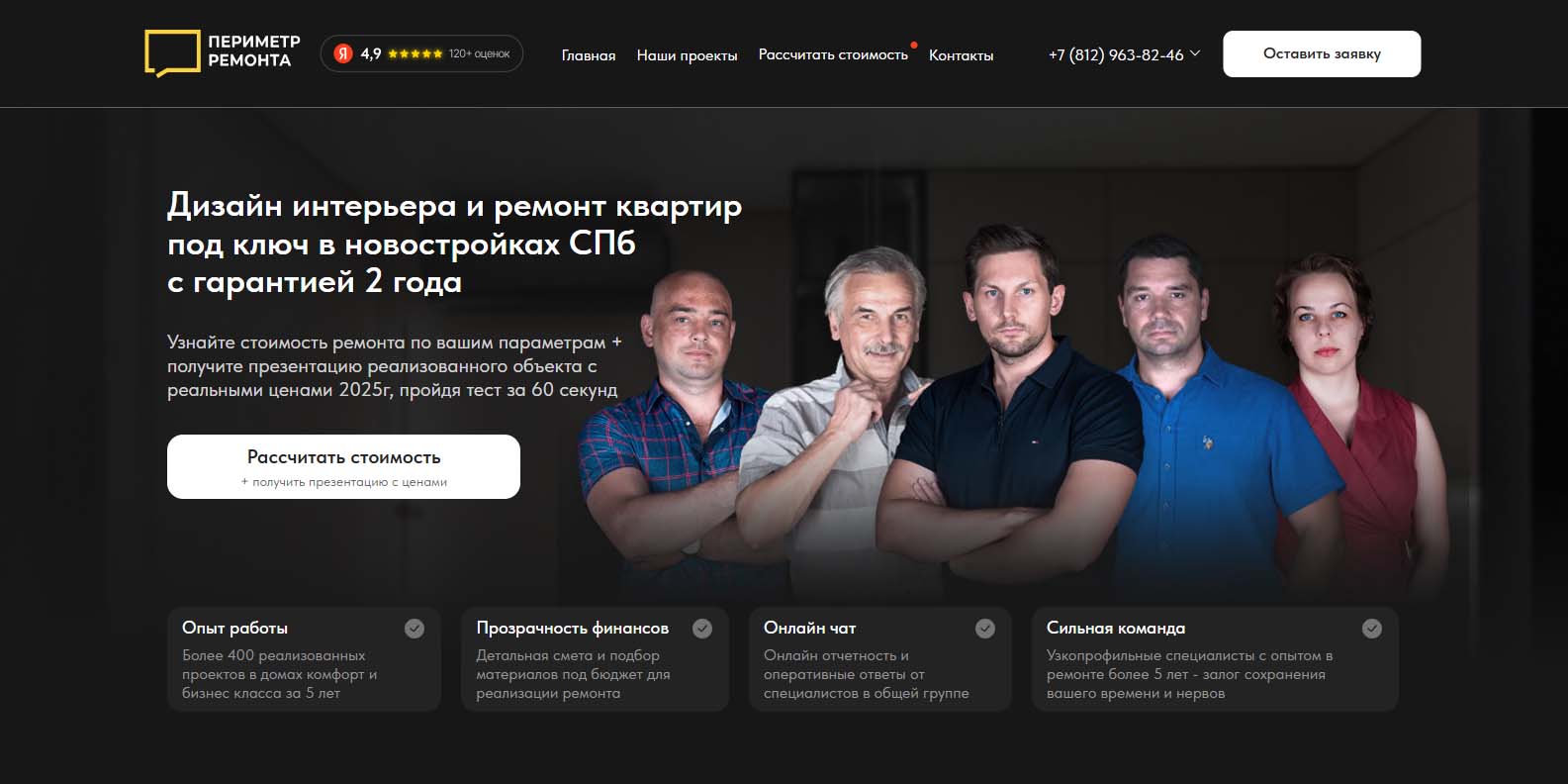Реализовали уже больше 1200 проектов. Занимаются ремонтом и отделкой квартир в Санкт-Петербурге и Ленинградской области. Каждый член команды отвечает за определенный этап ремонта, что позволяет работать качественно и без задержек. Для контроля процесса ремонта в квартире клиента устанавливается камера видеонаблюдения — информация поступает в режиме онлайн. Проводят экскурсии по текущим объектам для заказчиков, проводят обучение персонала.