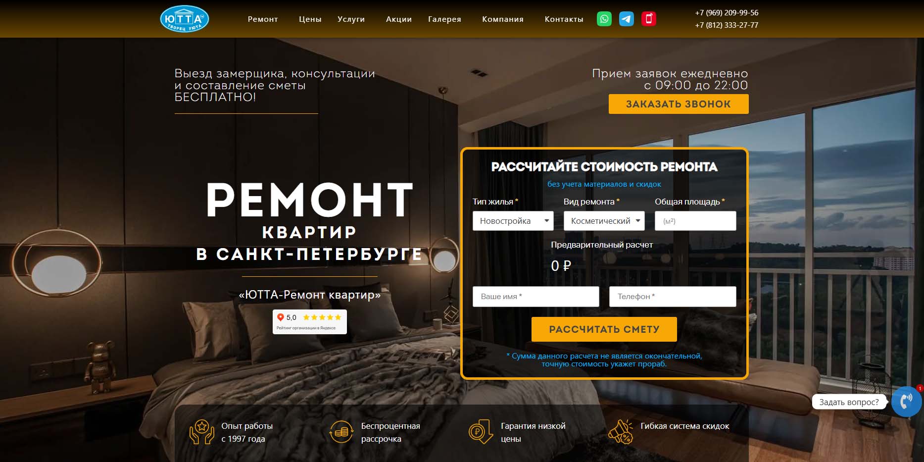 В EuroHouse заботятся, чтобы ремонт квартиры был продуманным и комфортным. При заключении договора создается чат в WhatsApp, куда отправляются фото- и видеоотчеты о ходе ремонта. Гарантируется качество всех выполненных работ на срок 7 лет. Вызов замерщика — бесплатный.