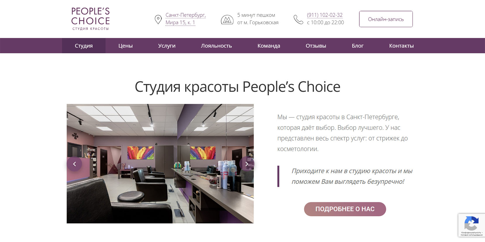 Студия красоты с душевным сервисом в центре Санкт-Петербурга. Главный принцип работы: отказаться от стандартизации красоты и подчеркивать индивидуальность каждого клиента. Оказывают такие услуги, как маникюр, оформление бровей и ресниц, макияж, стрижки и окрашивание.