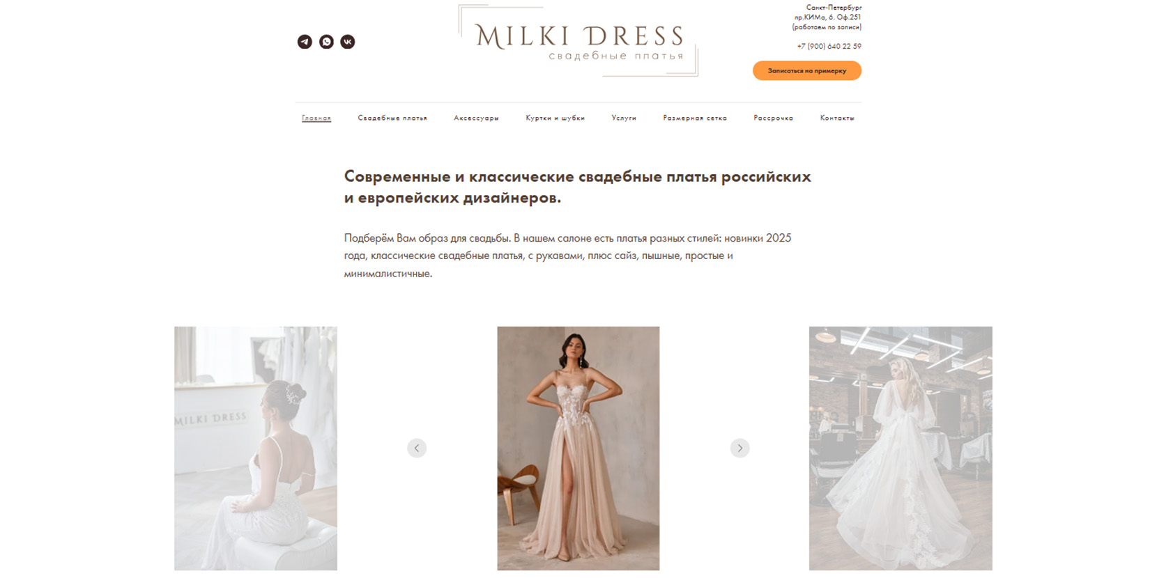 Здесь представлены как классические модели свадебных нарядов, так и популярные фасоны и силуэты платьев. При пошиве использованы французские кружева, мягкий фатин, струящийся шифон, матовый атлас и другие качественные материалы. Подобрать наряд здесь можно практически для любой невесты: есть варианты от минималистичных до роскошных, размерный ряд — от 38 до 52. Примерка проходит с профессиональным стилистом. После покупки в салоне скорректируют длину свадебного платья и подгонят его по фигуре.