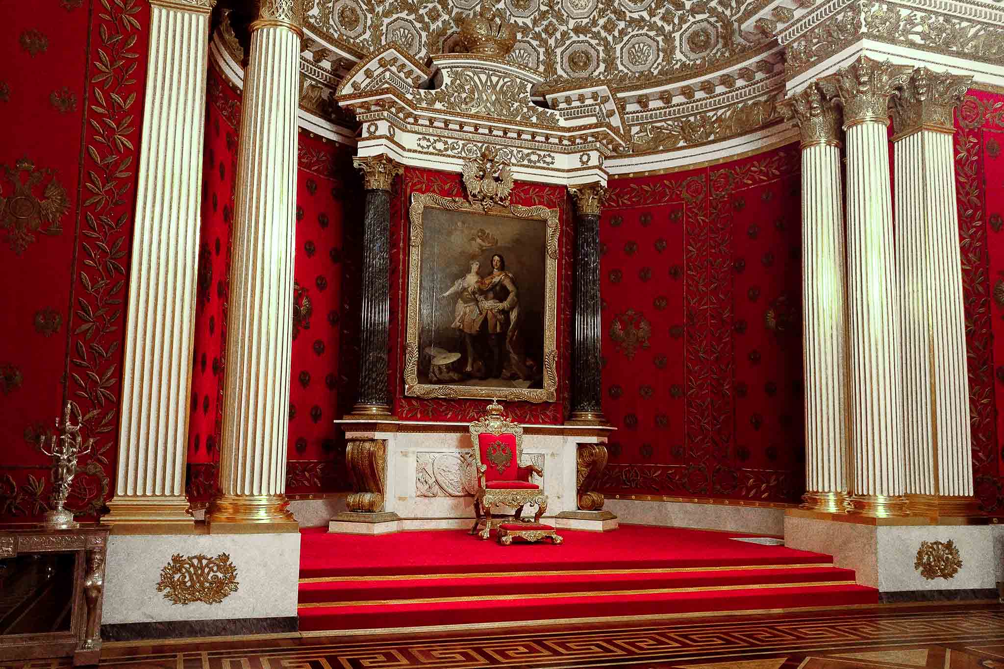 Посвящен памяти первого русского императора Петра Великого. Красный французский бархат, позолота, выполненный в том же стиле трон… Интерьер декорирован вензелями, коронами, двуглавыми орлами. Один из самых величественных залов Эрмитажа призван напоминать о силе и богатстве российской державы.