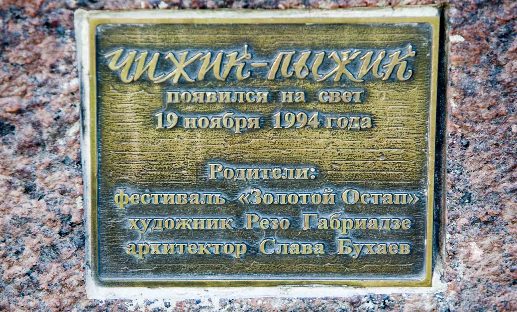 Памятник Чижику-пыжику установили 19 ноября 1994 года. Идея увековечить героя шуточного стихотворения неизвестного автора пришла во время проведения в городе Фестиваля сатиры и юмора. Для воплощения в жизнь задумки по созданию памятника потрудились двое талантливых людей – грузинский скульптор Резо Габриадзе и архитектор Вячеслав Бухаев.