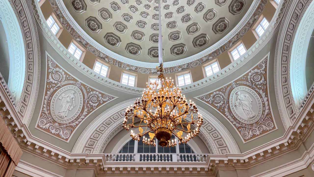 Купольный зал украшают великолепные настенные фрески в стиле гризайль, созданные в начале XIX столетия по проекту архитектора Карло Росси. Над оформлением зала работал известный художник-декоратор Джованни Батиста Скотти. Темами настенных композиций, имитирующих объемную лепку, стали сюжеты из гомеровской «Илиады».