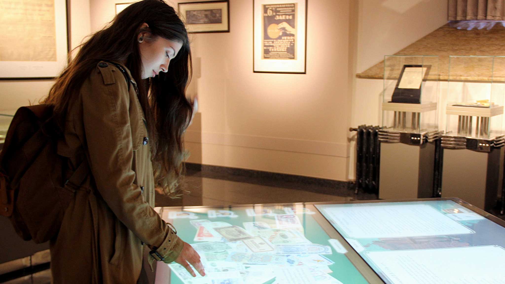 Интерактивные технологии делают процесс знакомства с Музеем истории денег увлекательным и комфортным. Возле витрин установлены сенсорные киоски, на экраны которых можно вывести подробную информацию об экспонатах, увеличить их изображение, что особенно актуально для предметов небольшого размера — в частности, монет.