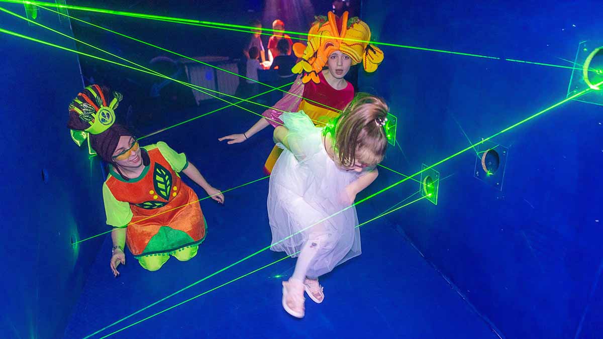 В распоряжении гостей — площадка 300 кв. м с банкетными зонами. Программа составлена с учетом возраста гостей и так, чтобы погрузиться в приключения: есть лазерные лабиринты, головоломки в «Храме джунглей», прыжок веры в портал, битва с безумцем, поиск сокровищ на Львиной горе. Атмосферу создают дымовое и световое шоу, музыкальное сопровождение. Торт можно принести с собой или заказать на месте.
