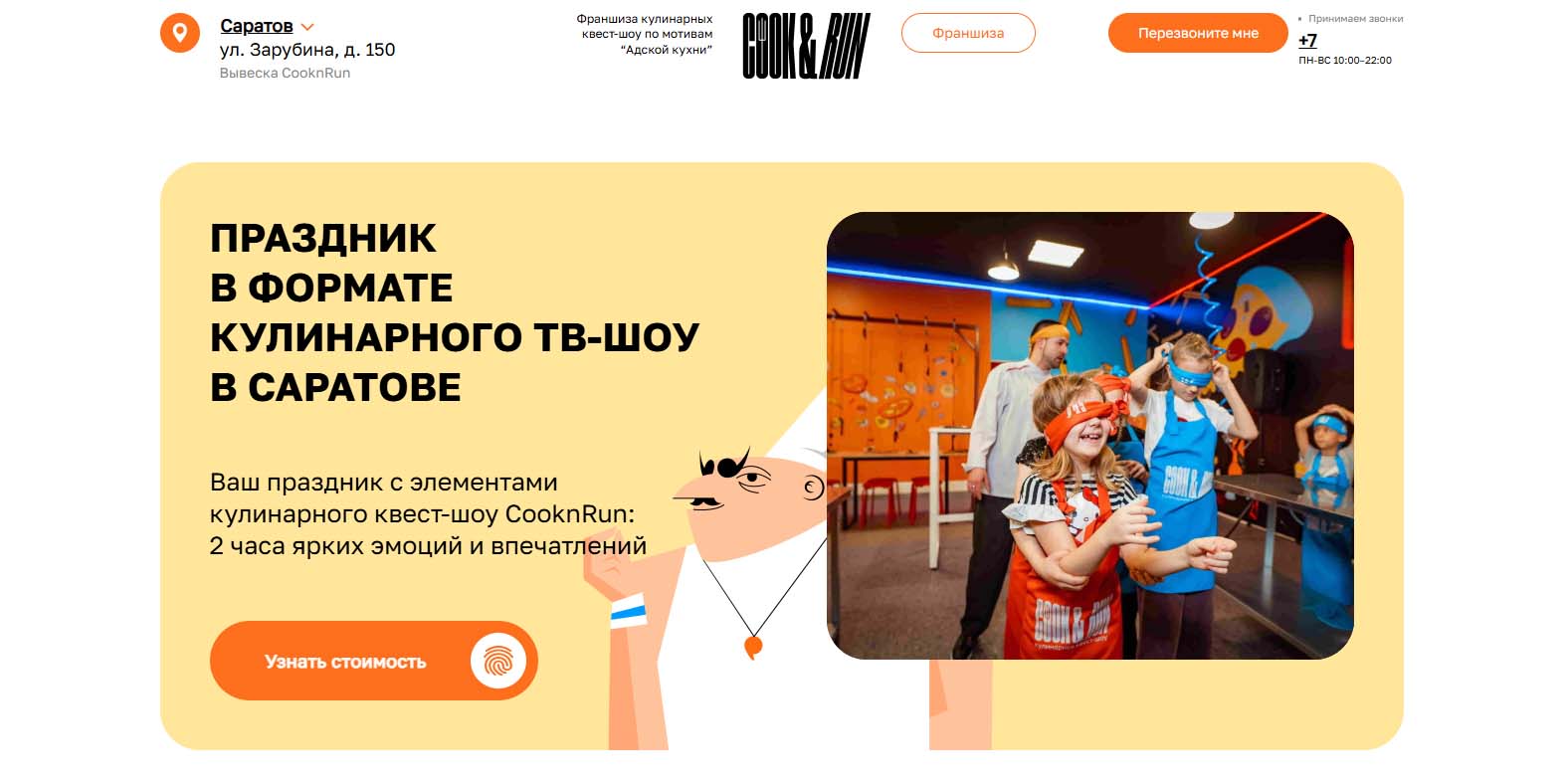 Этот формат праздника объединяет квестовые испытания и кулинарный мастер-класс. Программа длится 2,5 часа и подходит для участников от 6 лет, компания может насчитывать от 6 до 120 человек. В основе — командная игра, вдохновленная кулинарными телешоу. Участники готовят, проходя испытания под руководством харизматичных су-шефов и строгого мастер-шефа. Фирменная форма, стилизованное пространство и необычный реквизит создают эффект погружения в атмосферу кулинарного шоу.