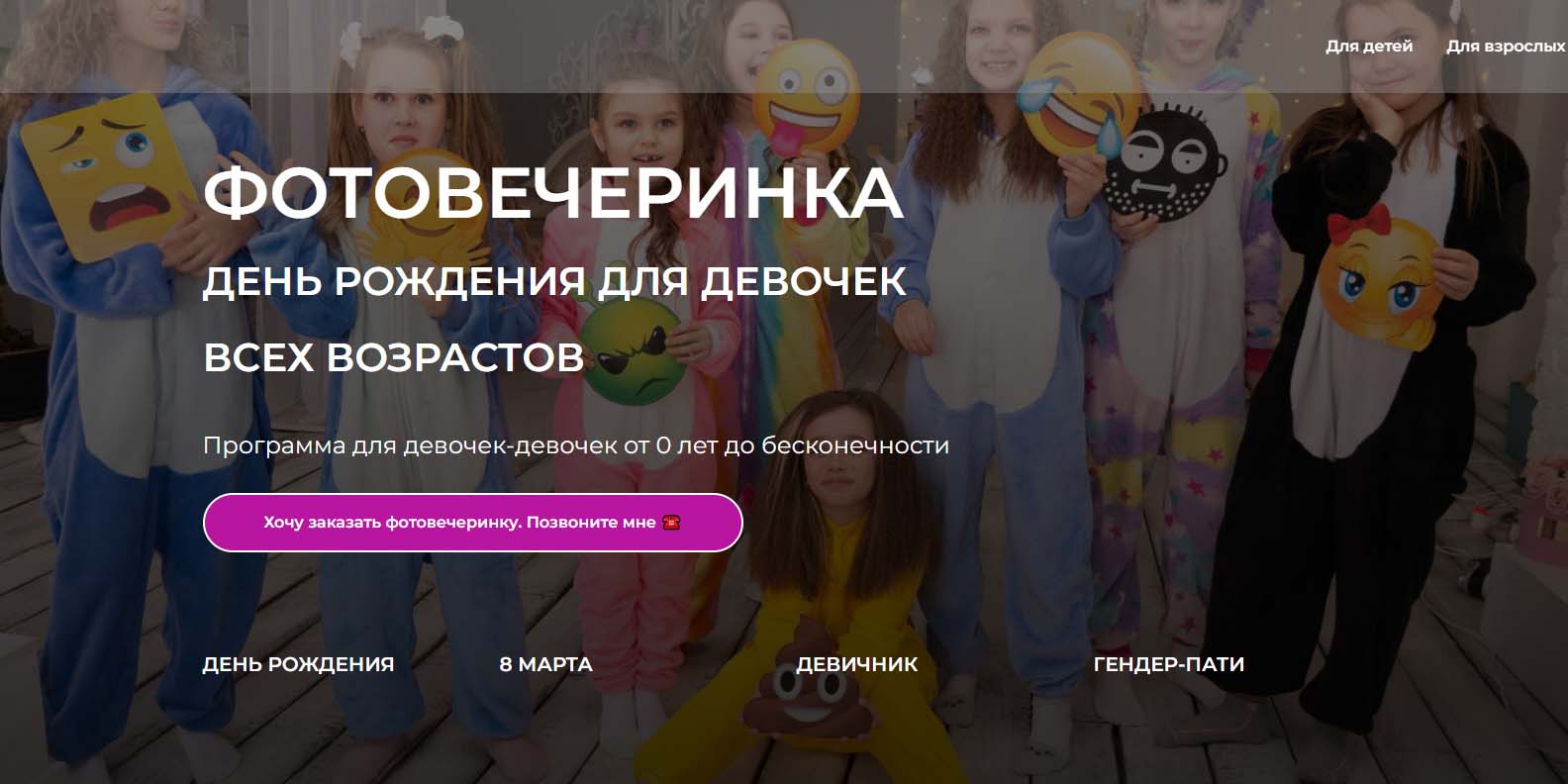Студия организует праздники под ключ: берет на себя все — от подбора программы до сервировки стола и заказа торта. В портфолио более 1000 мероприятий, среди которых дни рождения, выпускные и новогодние праздники. Клиентам предлагаются готовые тарифы, к которым можно также заказать дополнительные услуги от 1000 рублей. Студия помогает с оформлением зала, подготовкой пригласительных, организацией шоу-программ (в арсенале — мыльные пузыри, научные эксперименты, тематические квесты).