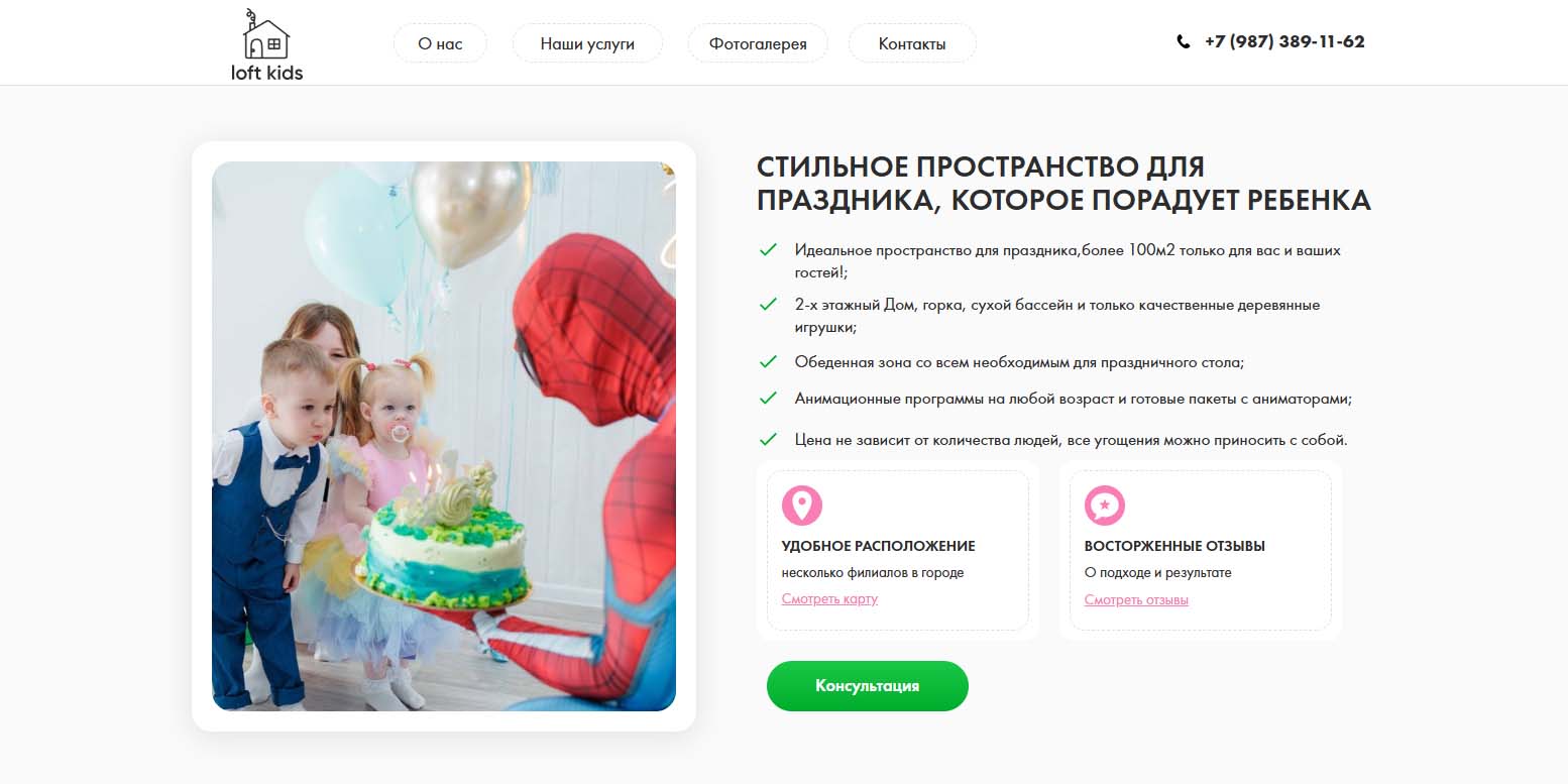 В лофте двухэтажные игровые зоны с горкой, сухим бассейном и деревянными игрушками. Общая площадь помещений более 100 кв. м, которые предоставляются целиком под праздник. Угощения можно приносить с собой, в обеденной зоне есть всё необходимое для сервировки стола. Анимационные программы подбираются под возраст детей, есть готовые пакеты с ведущими.