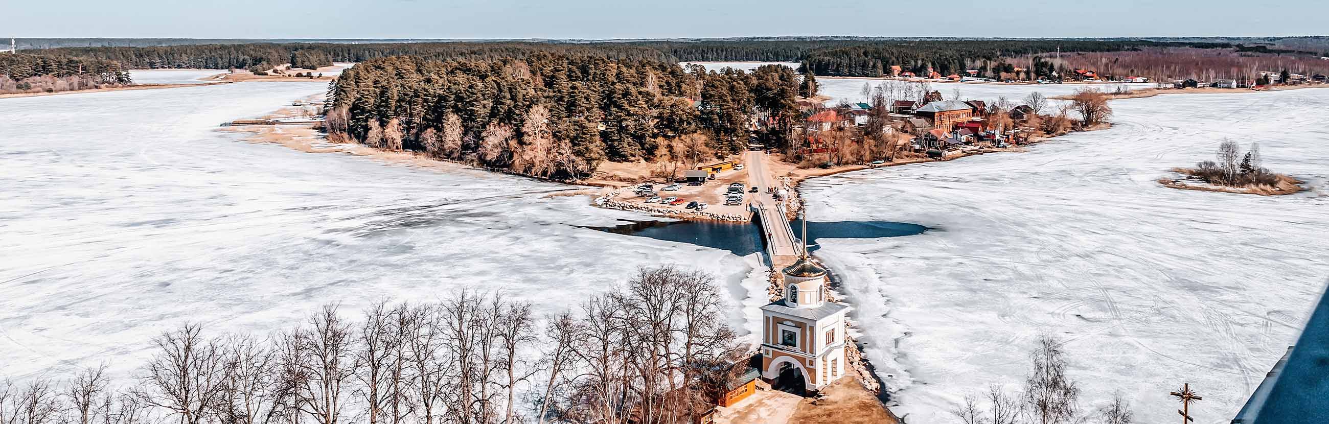 Недалеко от Селигера берет начало великая русская река Волга. Рождаясь из крошечного ручейка, она постепенно набирает силу, превращаясь в крупнейшую водную артерию Европы. Впрочем, зимой ручеек прячется под толщей снега, зато пронзительно красиво выглядит краснокирпичный женский монастырь во имя святой равноапостольной княгини Ольги, который стоит посреди белоснежного поля в окружении заснеженных елей.