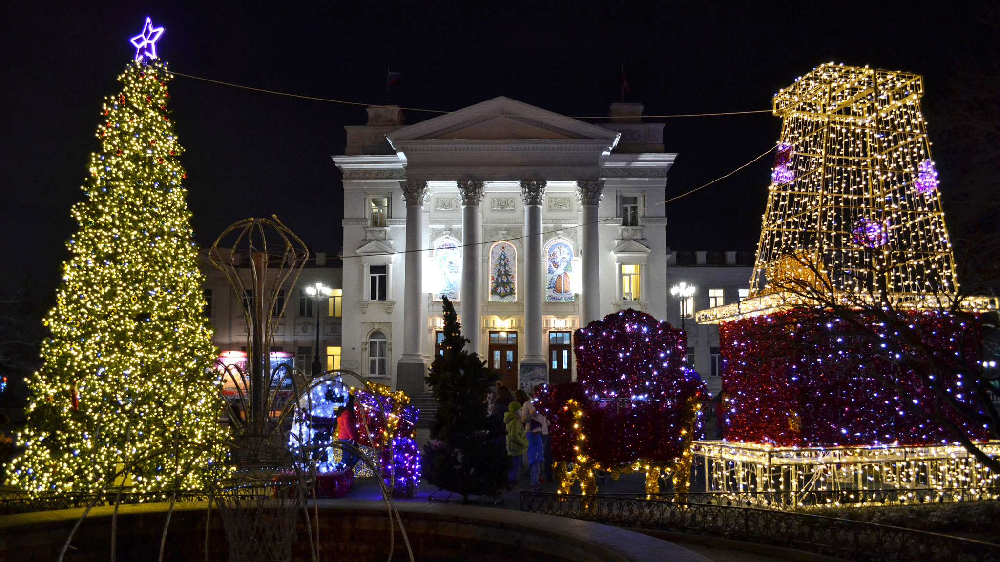Севастополь в декабре встретит вас яркими гирляндами, сияющими огоньками и украшенными к Новому году улицами. Праздничное настроение здесь появляется раньше, чем в других крымских городах. А все потому, что город наряжают с первых дней зимы. Гуляешь по набережной и глаза разбегаются: повсюду переливаются огнями светодиодные композиции в виде кареты для Золушки с упряжкой лошадей, привлекают взор огромные коробки с подарками, импровизированные фонтаны, ангелы, котики, фигуры космонавтов и величественных дам и кавалеров. Повсюду стоят различные инсталляции, самые популярные — цифры «2027» и 20-метровая надпись «Я люблю Севастополь». Особенно ярко они смотрятся в вечернее время, когда мерцают яркими красками. Возле композиций собираются очереди из желающих сделать снимки.