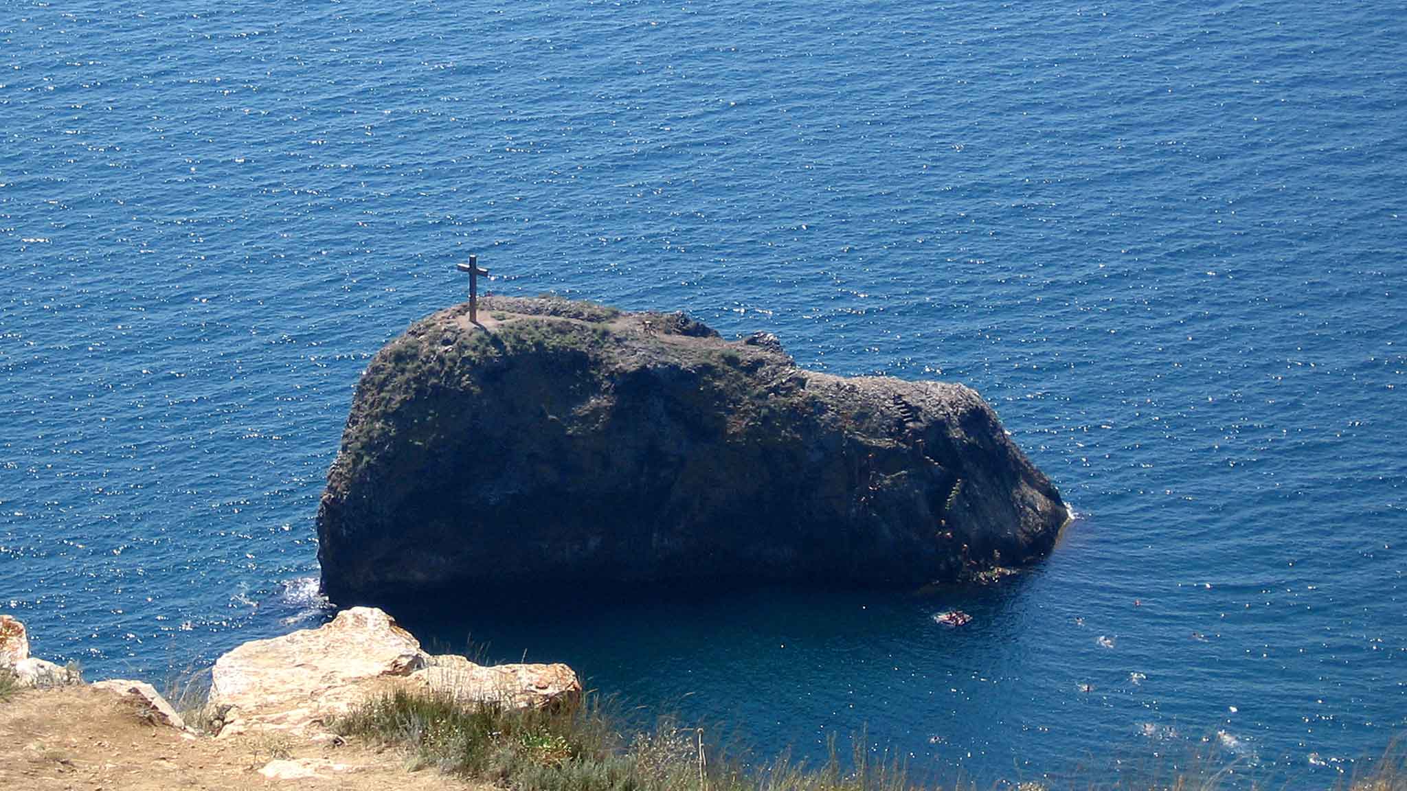 Георгиевская скала. Это та самая скала Явления, о которой мы говорили в начале. По легенде, именно на нее выбросило моряков, ставших основателями монастыря. На скале сейчас установлен большой крест в память об истории со спасенными жертвами кораблекрушения. Местные даже время от времени устраивают соревнования, кто быстрее доберется вплавь до скалы, чтобы потом попрыгать оттуда вдоволь.