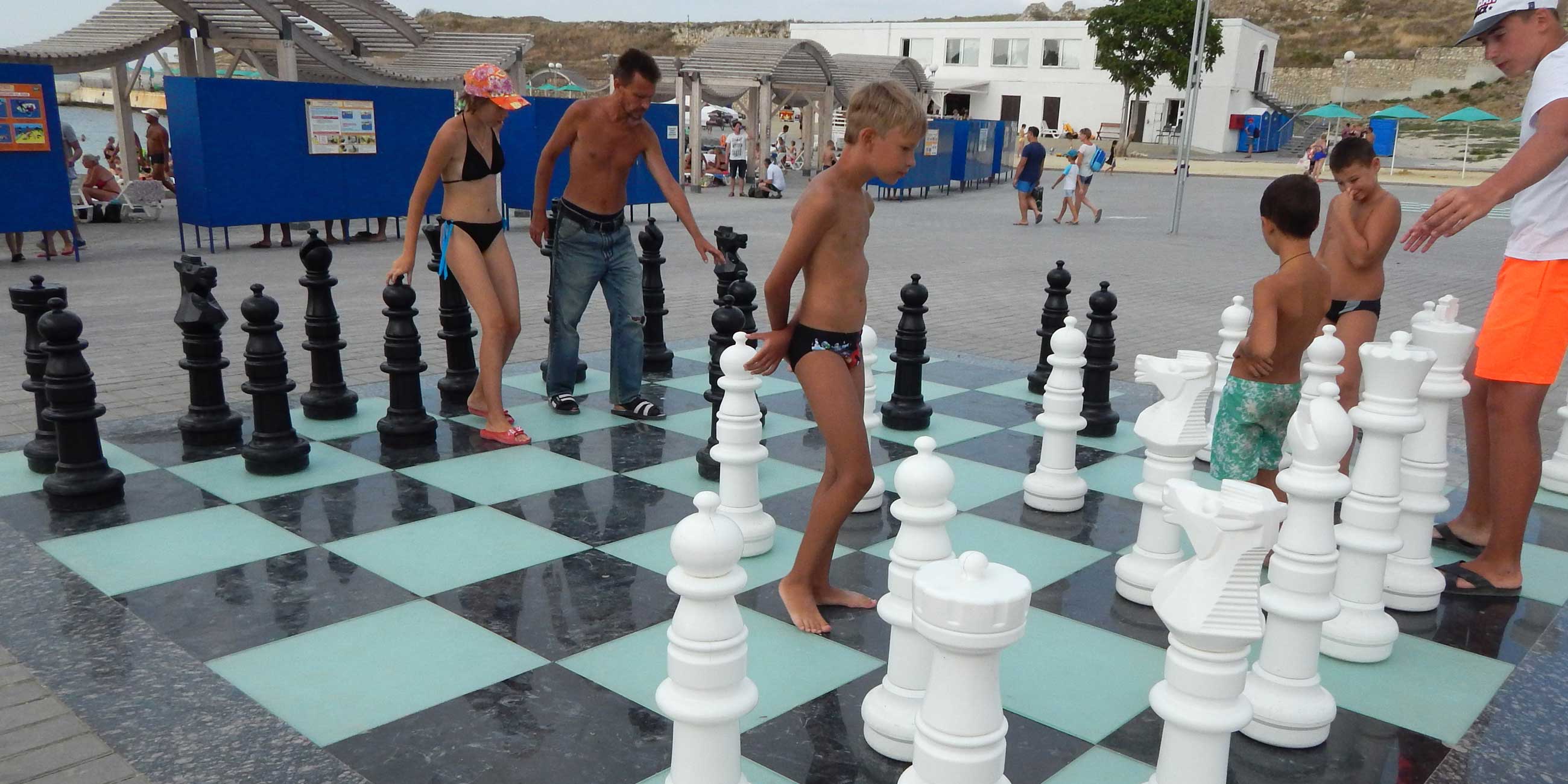 Рядом находятся две площадки для детей с горками в виде корабля и сказочного терема. Поиграть бесплатно предлагается в гигантские шахматы, а также футбол на просторном поле рядом.