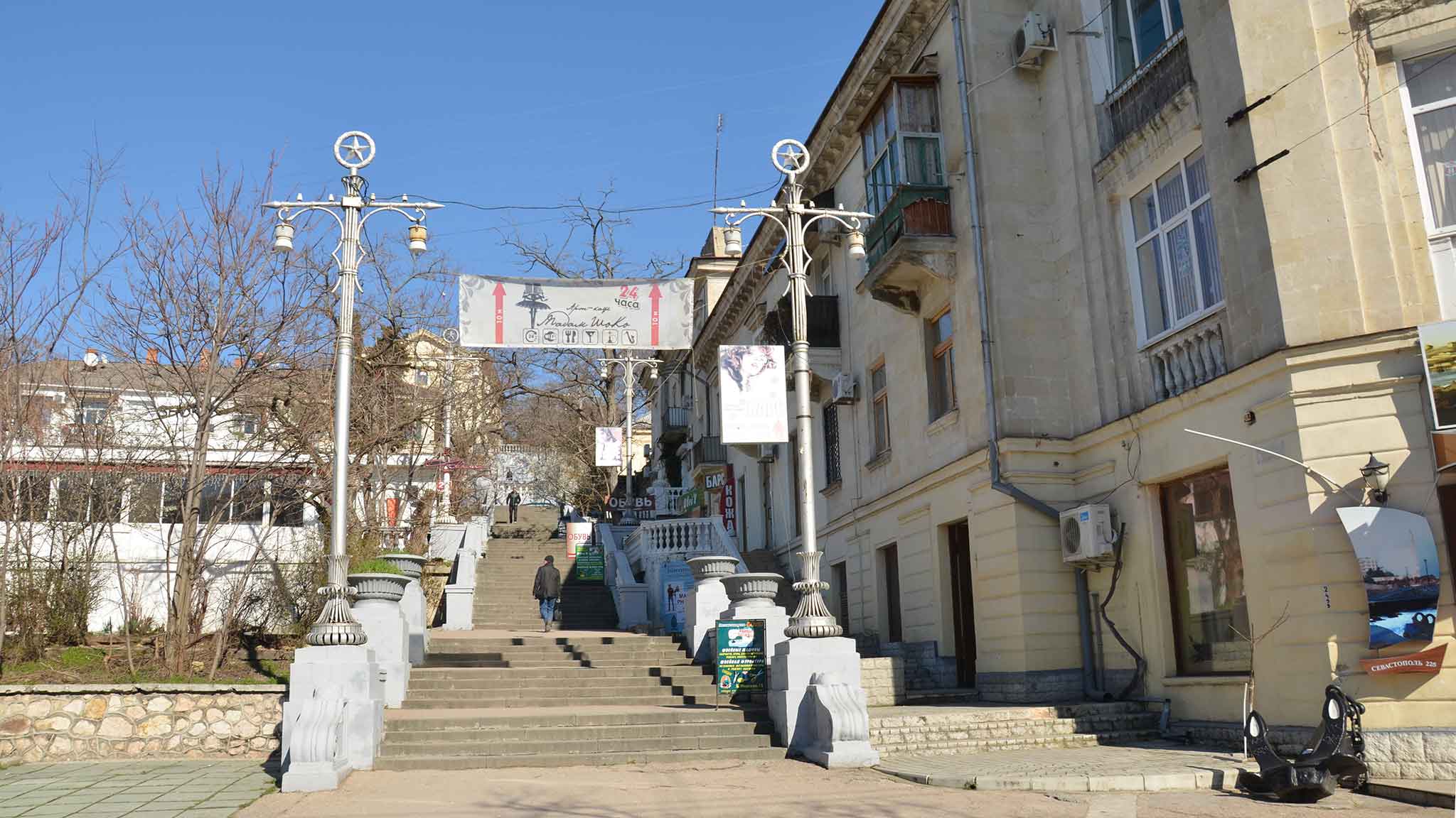 Севастополь — город якорей и лестниц, он всегда был воплощением морской романтики, славных побед и ветра дальних странствий. А еще это город, расположенный на крутых горных склонах. Местами крутые и неприступные скалы являются являются тут частью улиц — этакие каменные стены, по которым карабкаются вверх или сбегают вниз узкие улочки-лесенки, именуемые в Севастополе по-корабельному трапами. Особенно это касается центральной части города.