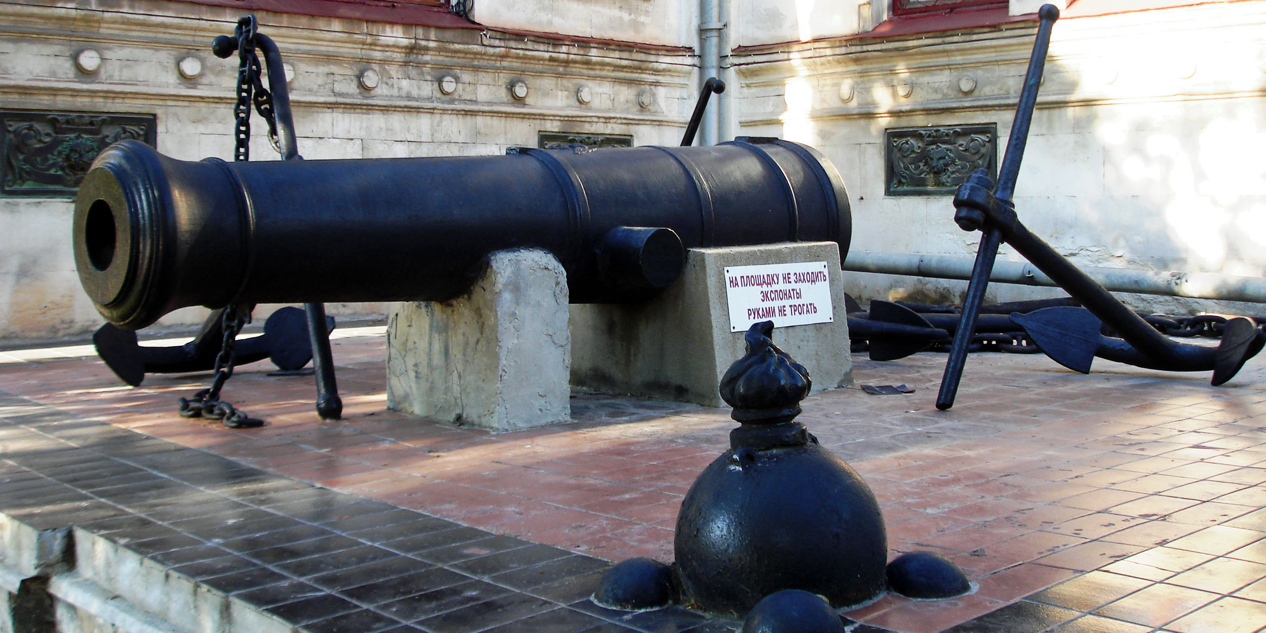 Еще одна экспозиция Военно-исторического музея Черноморского флота представлена во дворе. Там вы увидите настоящие пушки и мортиры, адмиралтейский якорь, крылатую противокорабельную ракету и различную военную технику.