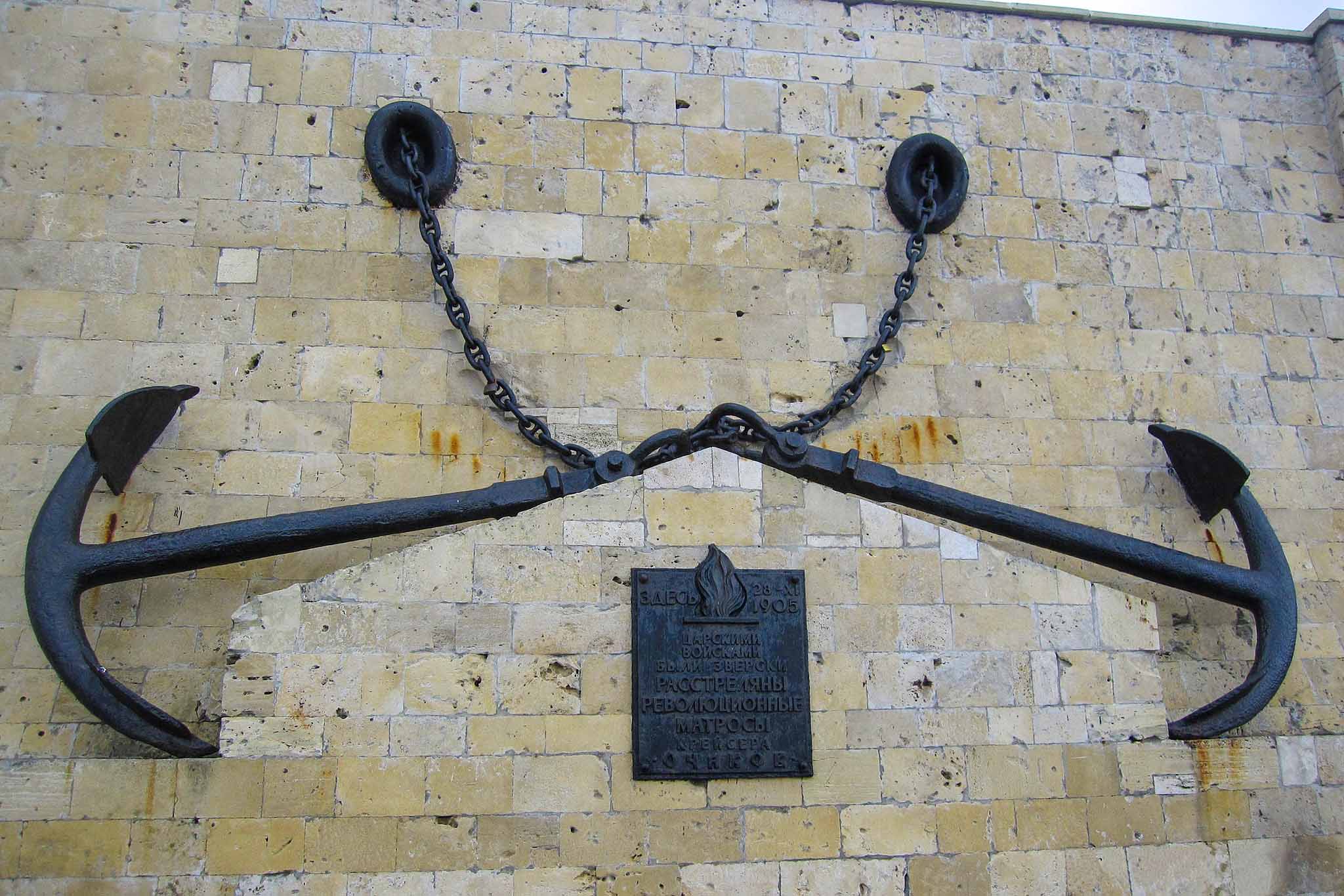 В 1905 году восстание было жестоко подавлено, часть экипажа крейсера сослана на каторгу, а зачинщики расстреляны у белокаменной стены в Артиллерийской бухте. Сегодня на этом месте устроен мемориал. Здесь нет пафосных памятников — всего лишь два перекрещенных якоря, да отверстия от пуль в стене как вечное напоминание о подвиге революционных матросов и человеческой жестокости.