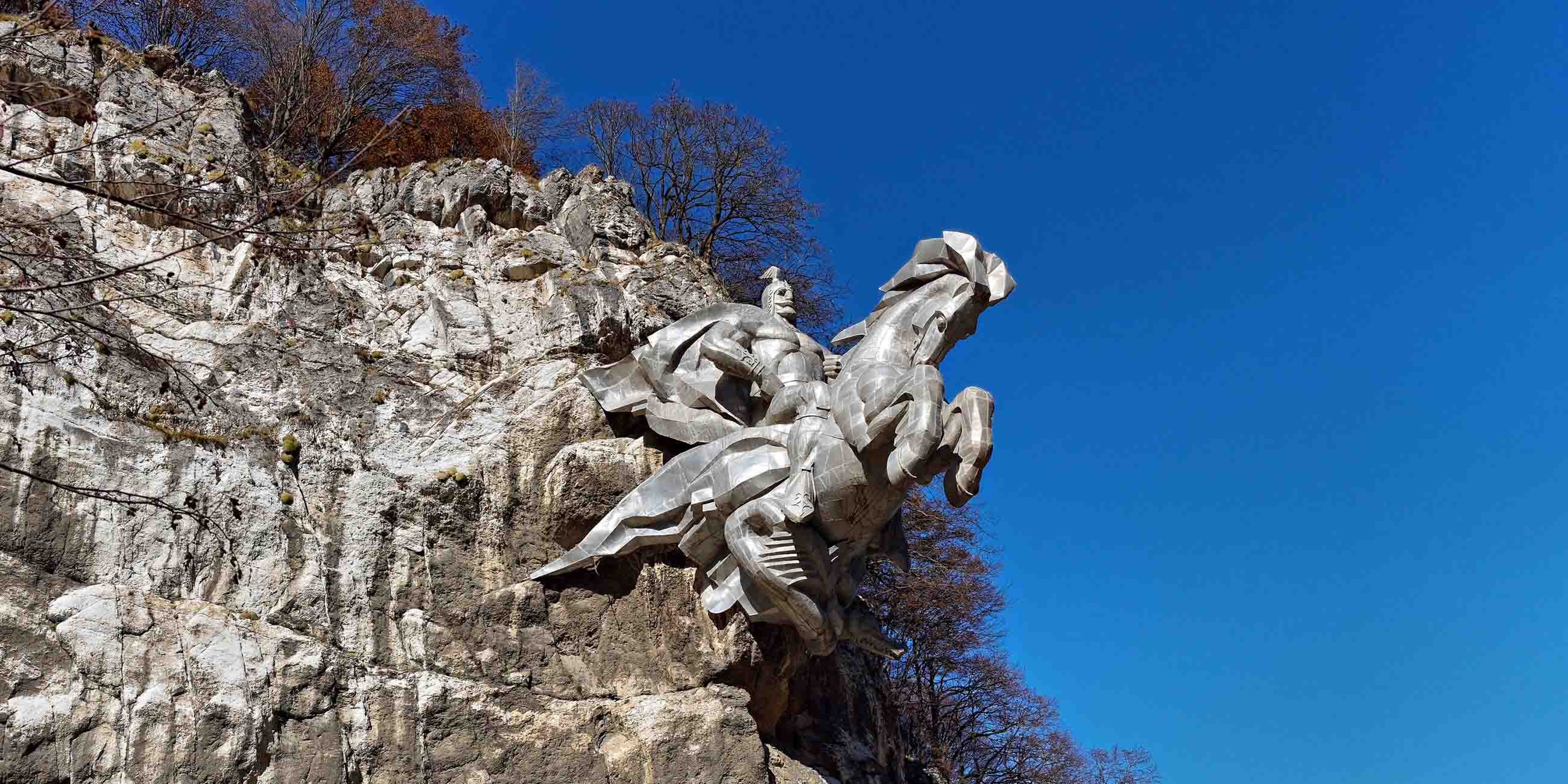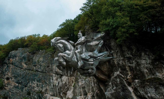Статуя находится на скале на высоте 22 метров над землей, поэтому памятник лучше запечатлеть на расстоянии — со стороны въезда в ущелье получатся самые удачные кадры выскакивающего из скалы богатыря на коне.