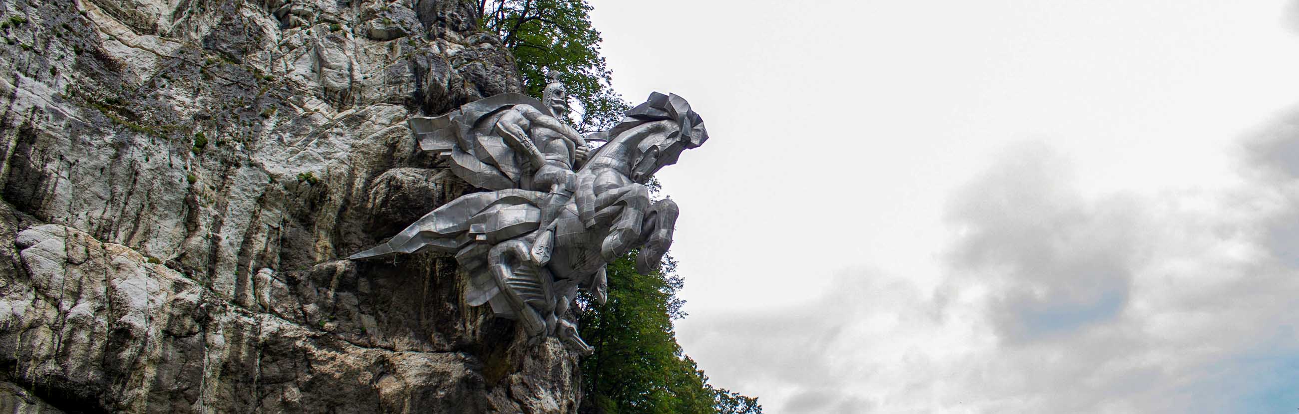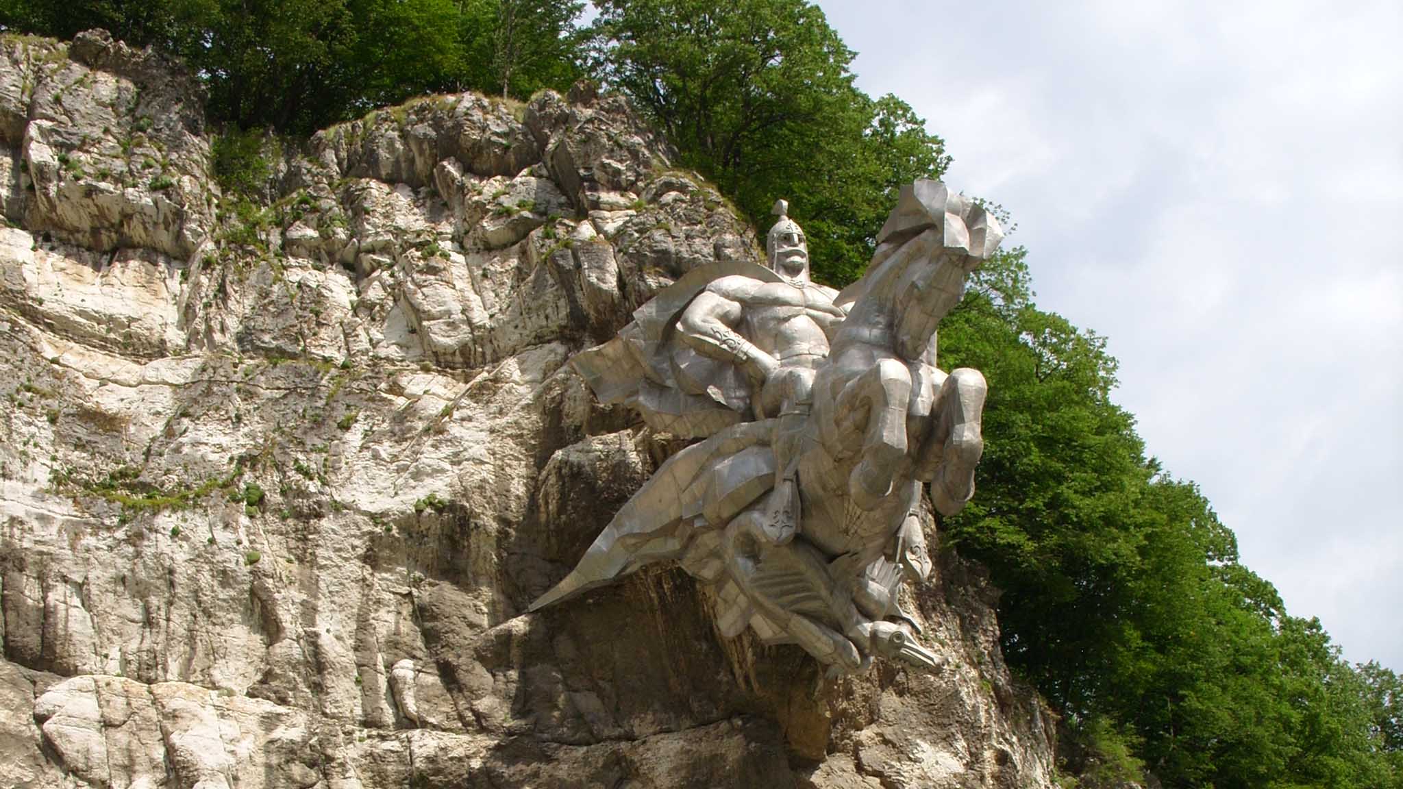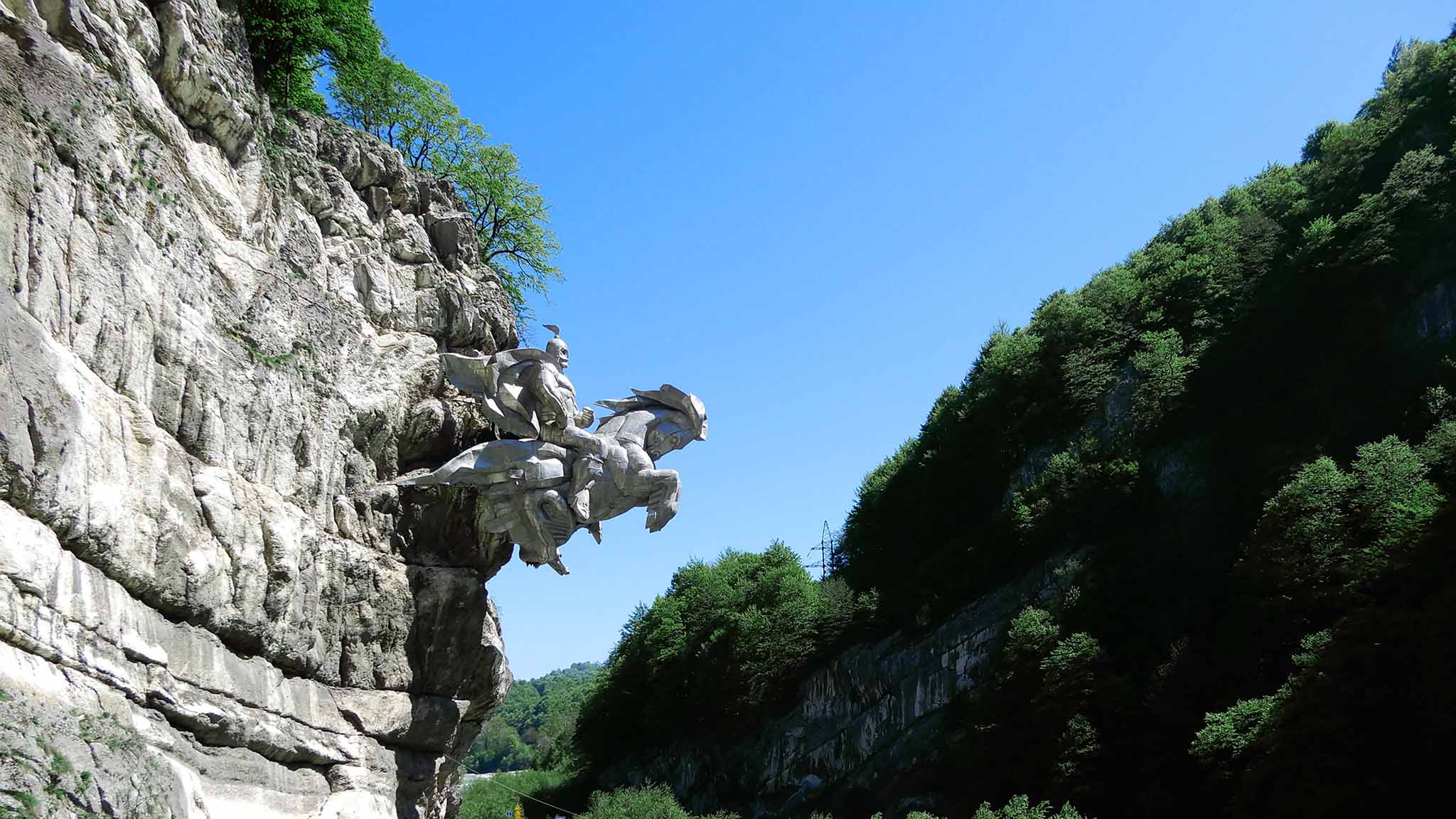 Герой нартского эпоса Уастырджи воплощен в наскальной скульптуре — наездник словно застыл в полете, вырвавшись из отвесной стены. На этом узком участке дороги путники просили помощи у высших сил. Здесь и установили памятник самому известному покровителю Северной Осетии.