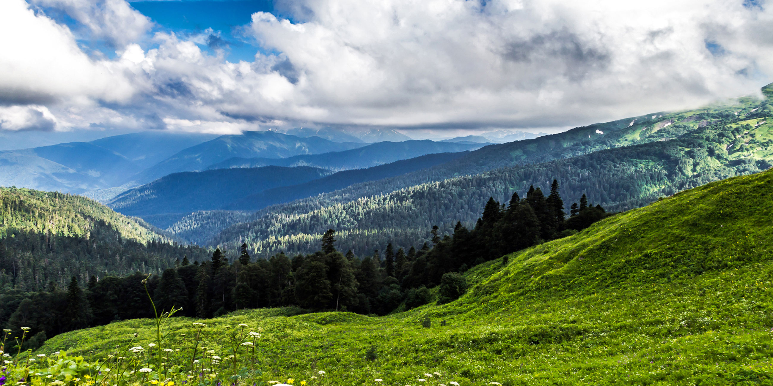 Около Ачипсинских водопадов в районе Красной Поляны. Особенно красиво там летом, когда склоны гор усыпаны зеленой травой.