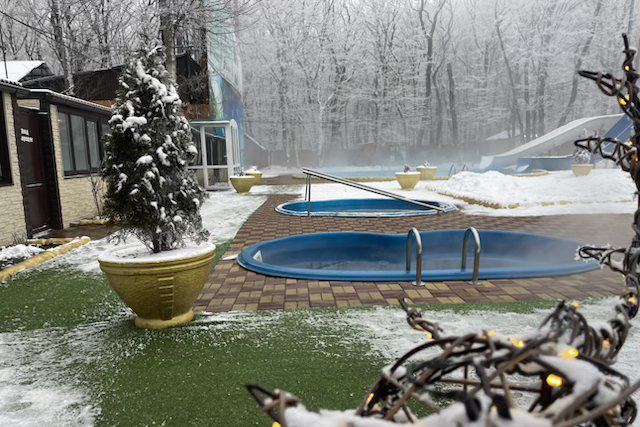 Овальный бассейн поменьше, но вода в нем зимой нагрета до 36 градусов, ласковая и теплая. Плавать в такой приятно согревающей воде под открытым небом — отдельный вид удовольствия. Купание дарит ощущение полного умиротворения.
