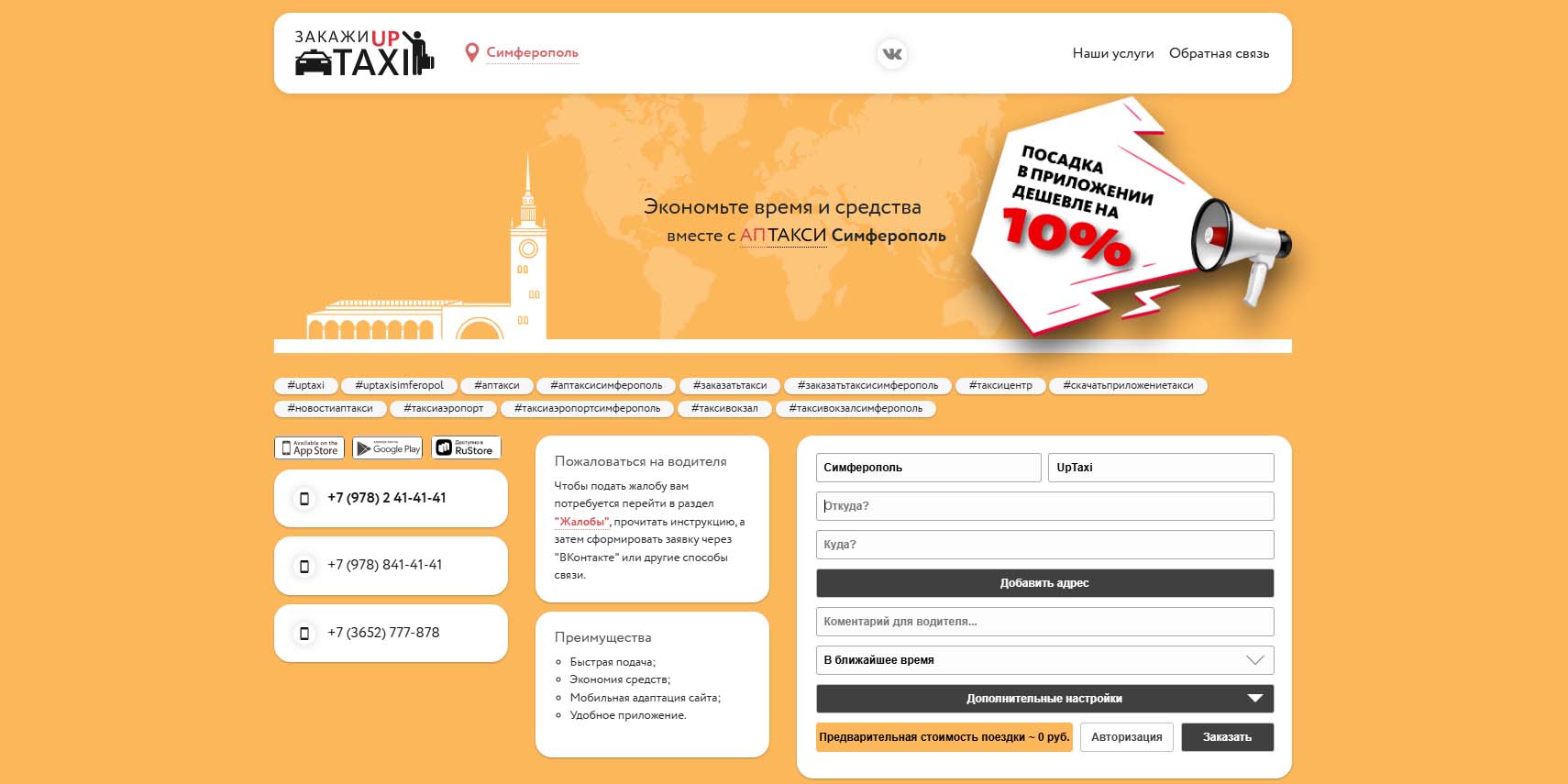 Достаточно популярная крымская служба такси. Этот сервис обещает быструю подачу машины и комфортную доставку до места назначения. Кроме этого, Uptaxi предлагает курьерскую доставку, пассажироперевозки на автобусах и микроавтобусах, трансфер и обслуживание торжеств. Работает по всему Крыму, есть система бонусов.