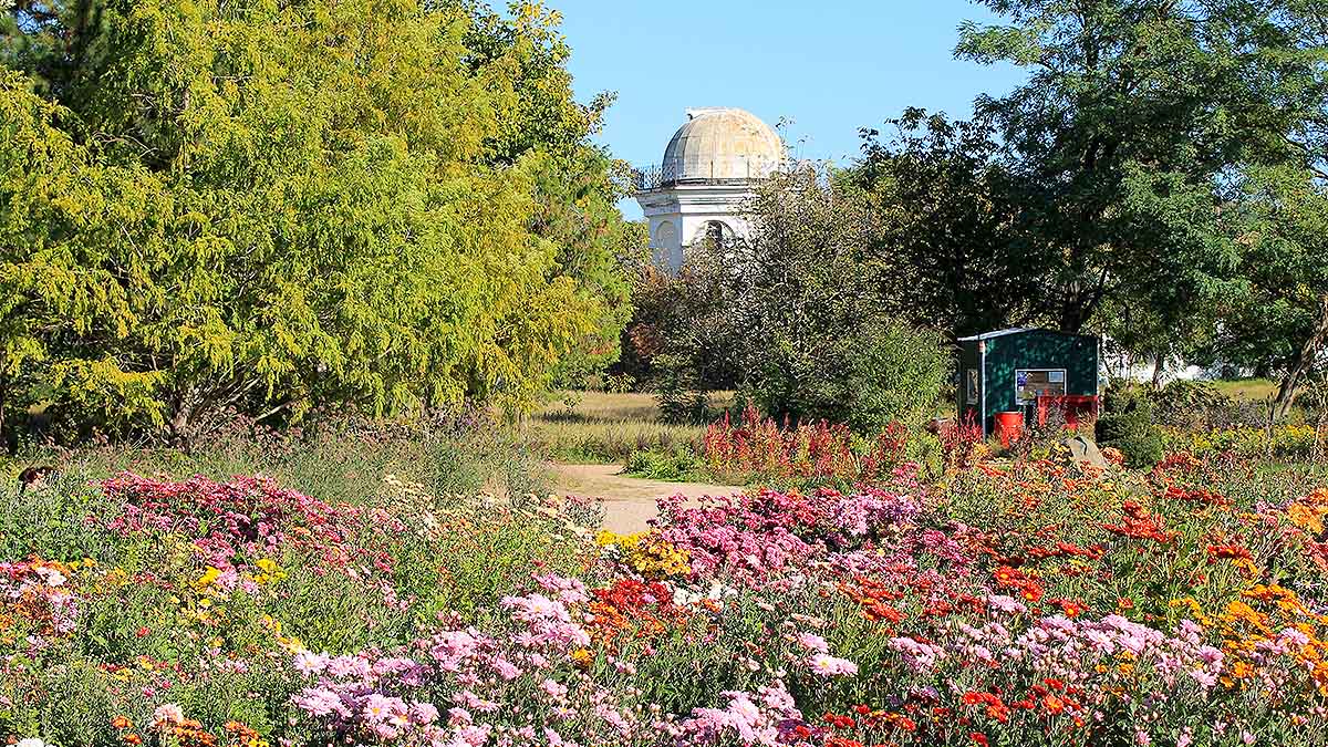 Пройдя насквозь японскую поляну, вы попадете в настоящий сосновый лес. Узкая тропинка под высоченными соснами ведет прямиком к имению Воронцова и главной достопримечательности ботанического сада — розарию. Десятки сортов роз не просто рассажены тут на большой территории — они образуют изысканные композиции, мастерски подобранные по цветам и форме. Следующей остановкой на нашем маршруте будет еще одна большая поляна, которая находится перед построенным в мавританском стиле имением основателя парка П.С. Палласа, здания, похожего одновременно на мечеть и на космическую обсерваторию.