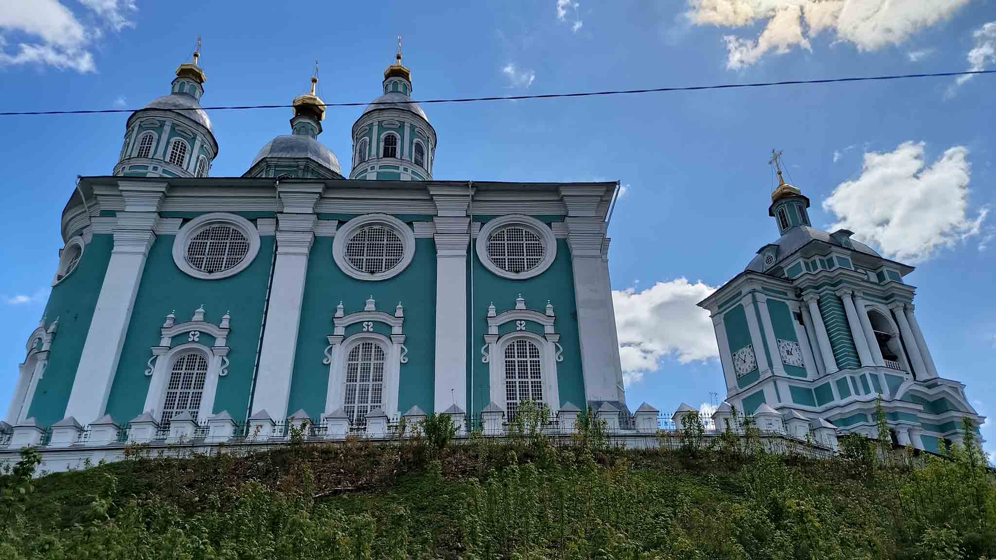 Главный храм Смоленской земли в честь Успения Богородицы был заложен еще в начале XII века Владимиром Мономахом. Здание простояло шесть столетий, пока в 1611 году в ходе русско-польской войны Смоленск не был взят захватчиками. Защитники города взорвали храм, который был восстановлен поляками, однако после возвращения Смоленска в состав русского государства он был окончательно разобран, а на его месте началось строительство нового. Оно получилось долгим и велось с большими перерывами. Нынешний вид собор приобрел в 1740 году. Храм избежал разрушения в ходе войны 1812 года (восхищенный Наполеон велел выставить около него охрану) и Великой Отечественной войны.