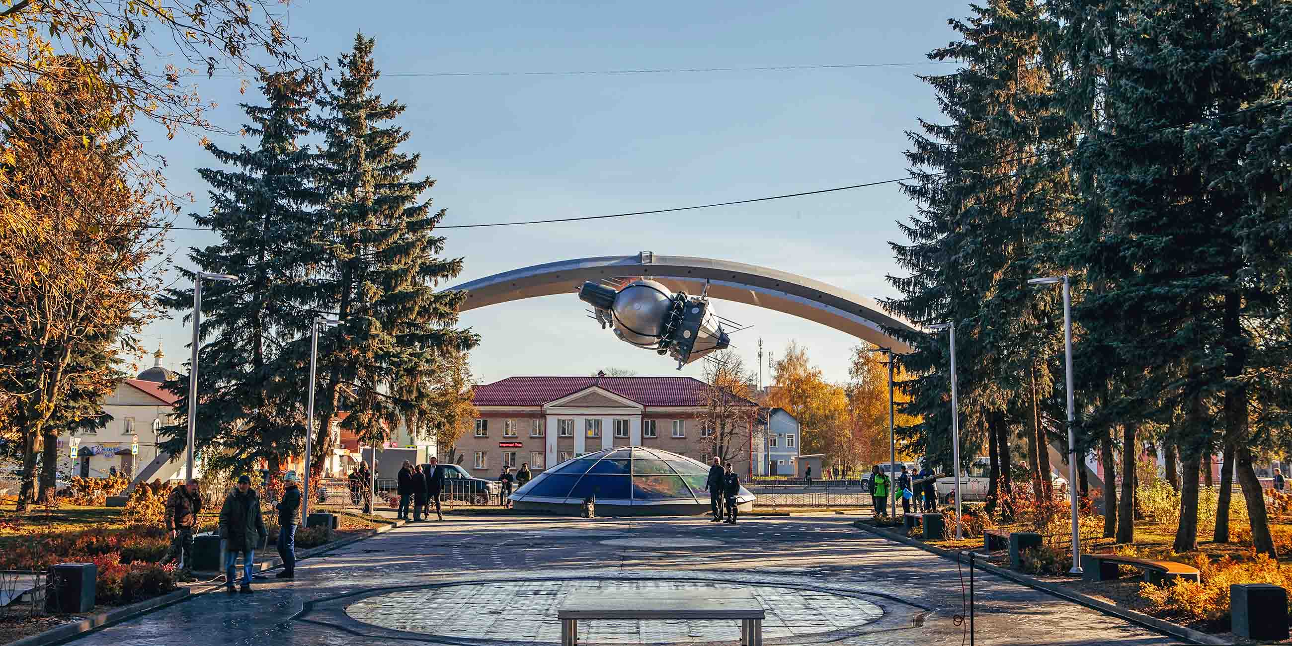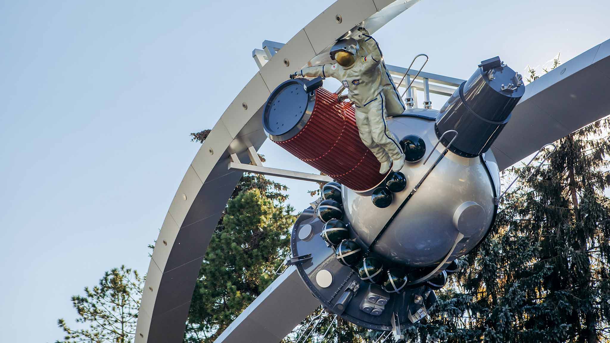 Космический корабль. На входе посетителей встретит инсталляция: на арке-орбите расположены корабль «Восход-2» в натуральную величину и выходящий из него космонавт в скафандре. Под аркой-орбитой находится стеклянная полусфера высотой 1,7 метра и диаметром 8,1 метра – Земля. В темное время суток сферу подсвечивают изнутри.