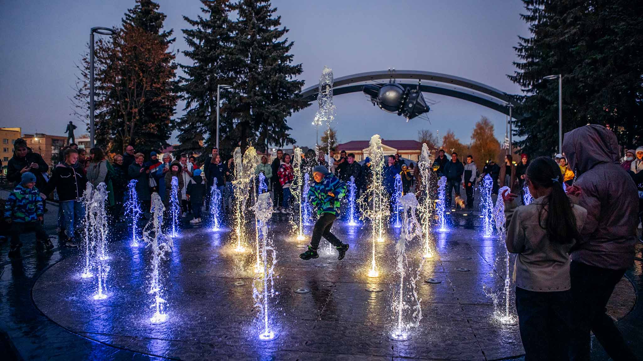 Фонтан «Солнце». Круглый «сухой» фонтан высотой 3 метра бьет в центре пешеходной площадки. Вода, по вечерам подсвеченная разными красками, вырывается наружу из форсунок.
