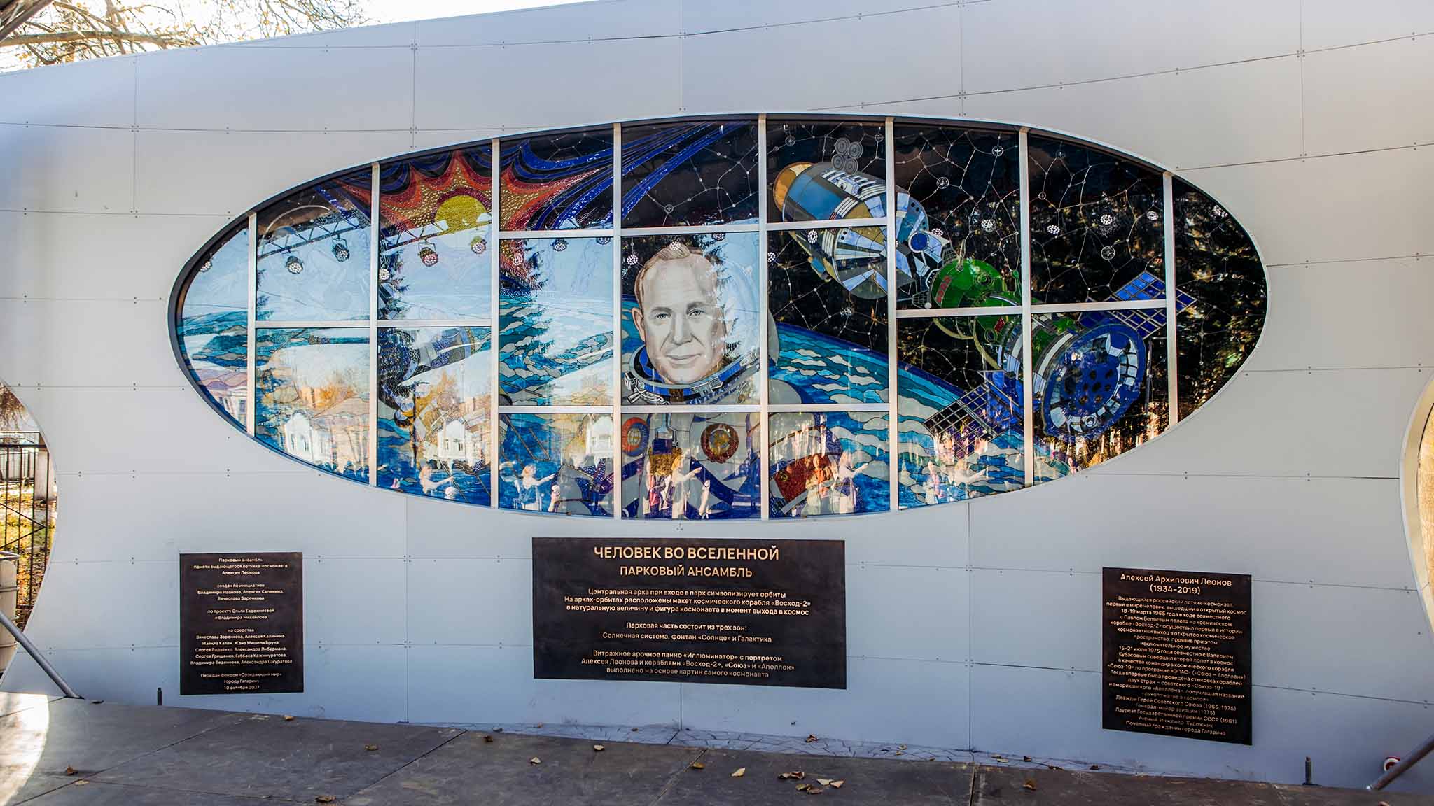 Иллюминатор. Витражное панно в форме арки-иллюминатора находится с противоположной стороны от арки с космическим кораблем. Из иллюминатора на посетителей смотрит Леонов на фоне космических кораблей.