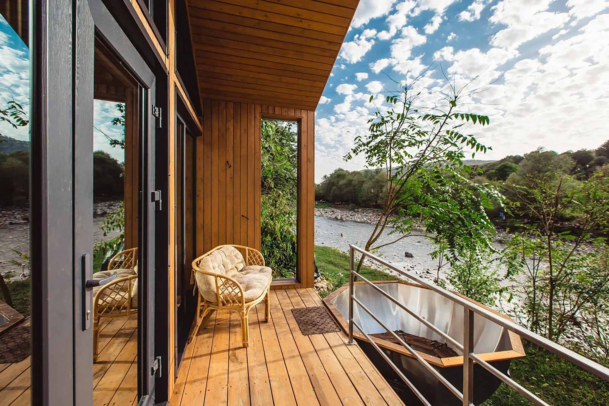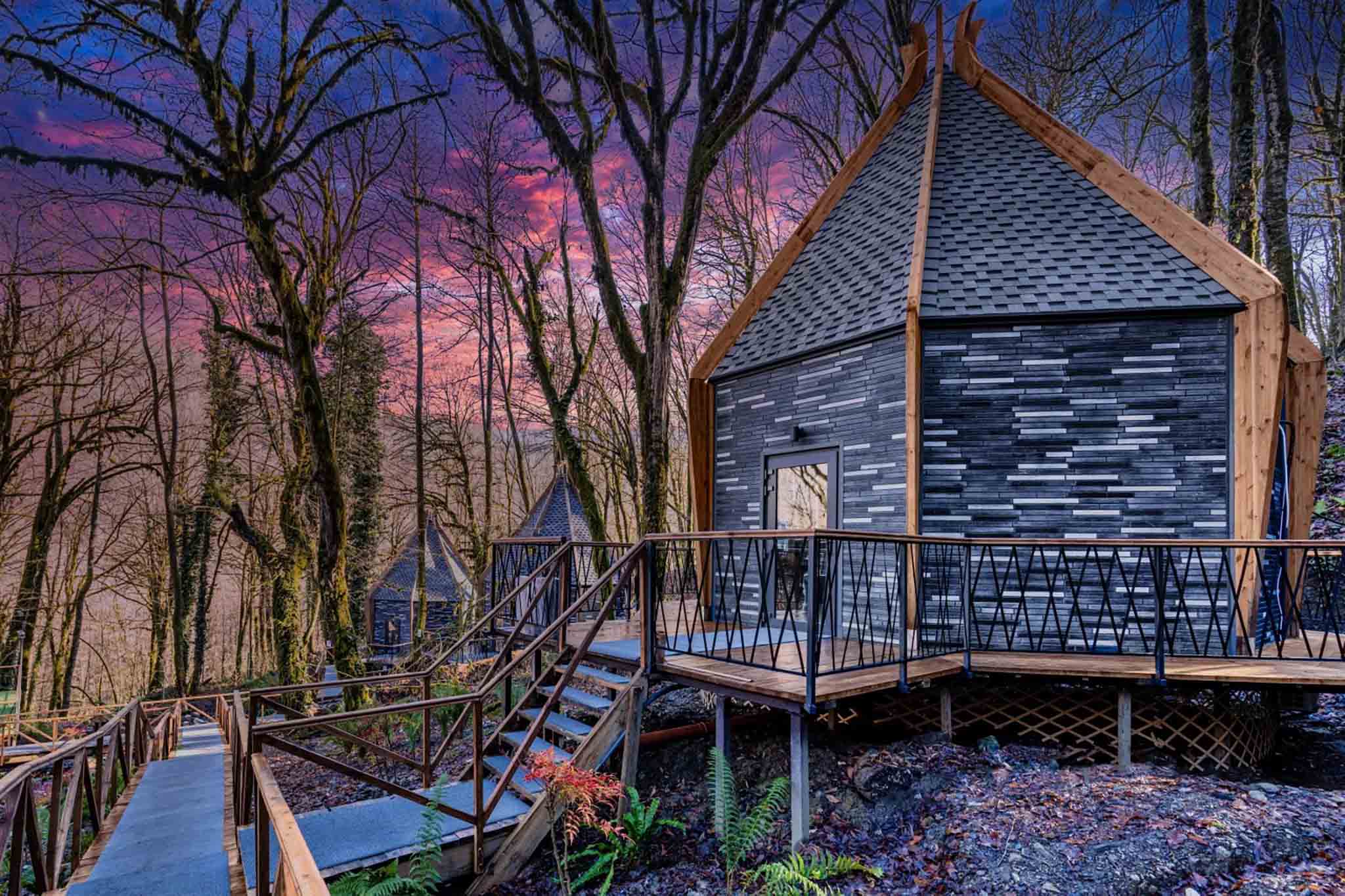 В густом субтропическом лесу стоят 25 оригинальных домиков-вигвамов с панорамными окнами и декором из натурального дерева. Гости наслаждаются пением птиц, видами горной реки, вкусными блюдами в ресторане, купанием в бассейне, игрой в мини-гольф и расслабляющими спа-процедурами. В пешей доступности — природные источники нарзана.