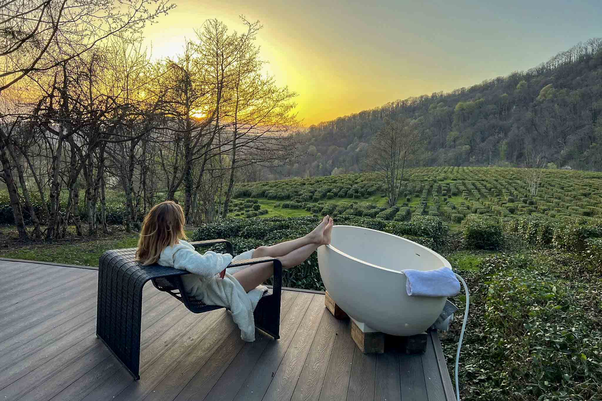 Единственный в России глэмпинг с обзором зеленых чайных плантаций. Туристы живут в куполах с санузлами и большими кроватями. Благодаря подогреваемой приточной вентиляции, сплит-системе и камину на дровах, внутри тепло в любое время года. Для релакса устроена баня на помосте с комфортной ванной-купелью. Отдыхающие с удовольствием посещают фабрику чая и гуляют по горным тропам.