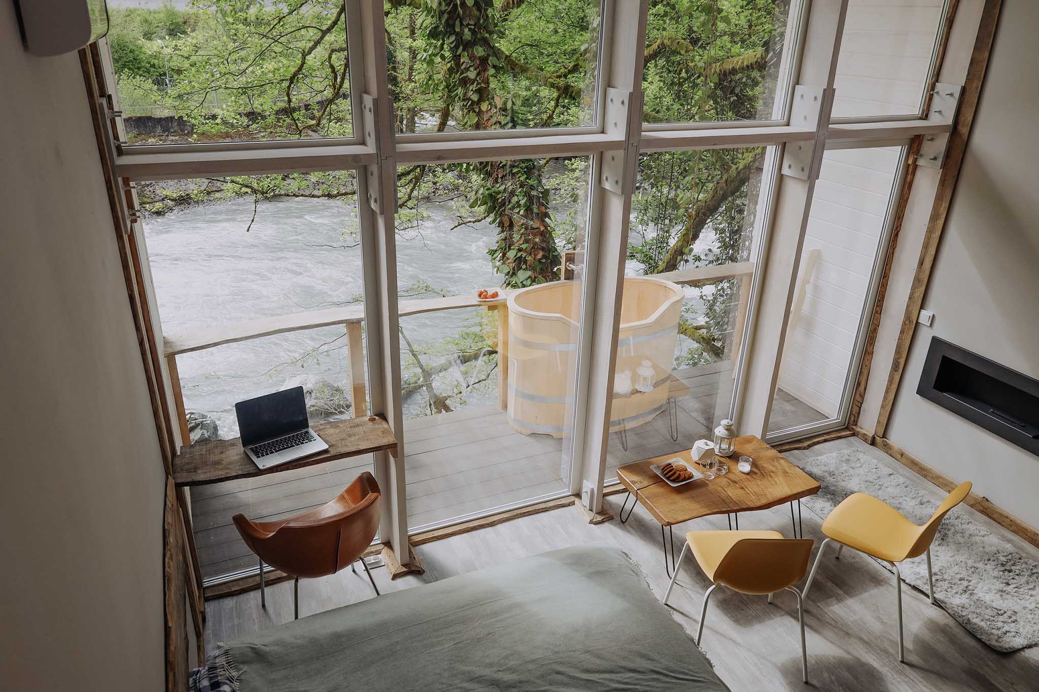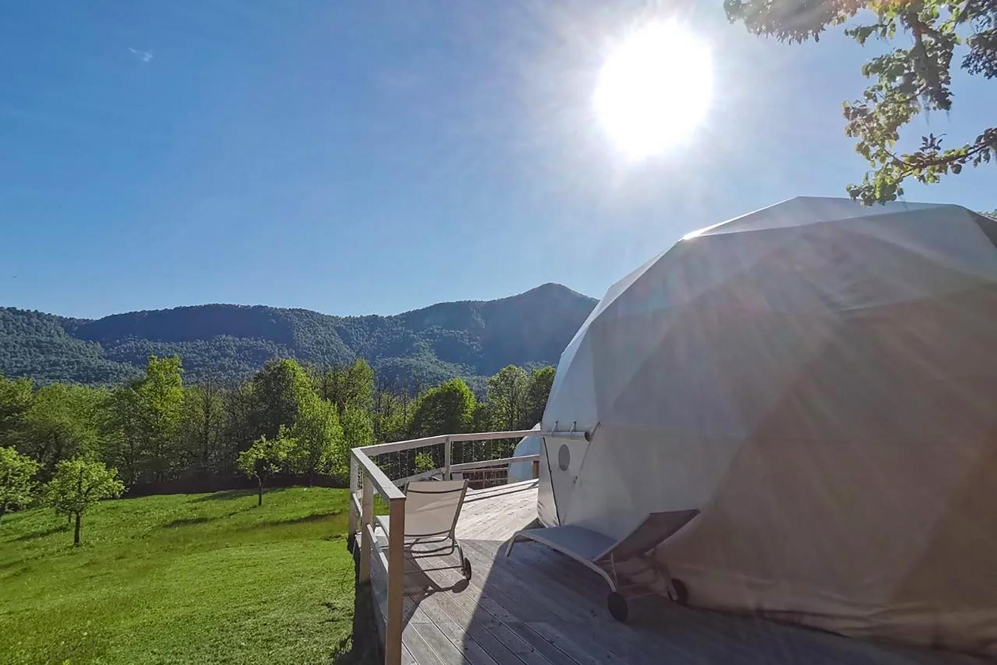 Эко-отель в Кавказских горах, недалеко от Сочи. К услугам гостей — современные купольные шатры с душем, туалетом и роскошным панорамным видом на горы. Внутри каждого стоят двуспальная кровать, столик и пара кресел. Завтраки включены в стоимость проживания. При желании можно заказать доставку еды из местного ресторана.