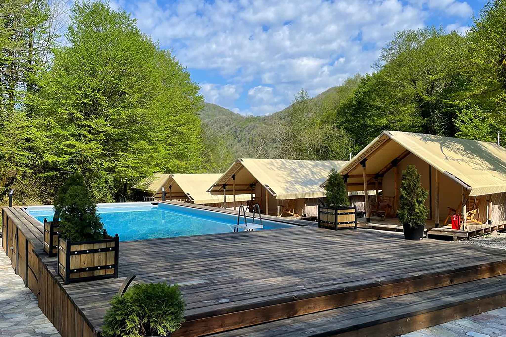 Недалеко от устья реки Хаджипсе путешественников принимают 12 больших трехместных шатров. В глэмпинге есть отдельные блоки с туалетами и душевыми с горячей водой, просторный зал-шатер с профессиональным светом и звуком, банный комплекс, теннисный корт, массажный кабинет, мангальная зона и подогреваемый бассейн. Для туристов организуют интересные экскурсии, морскую рыбалку и конные прогулки. До моря 15 минут пешком.
