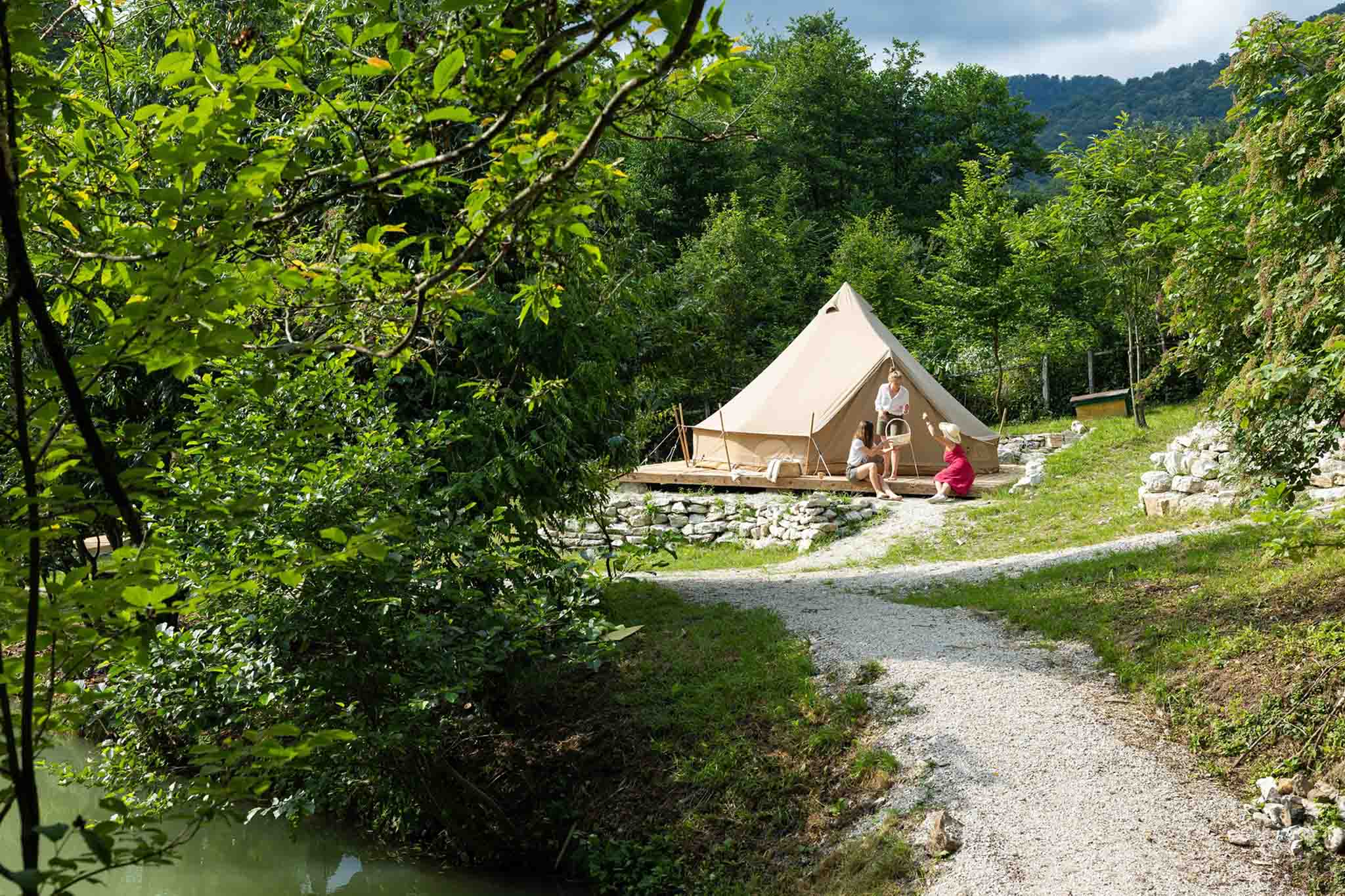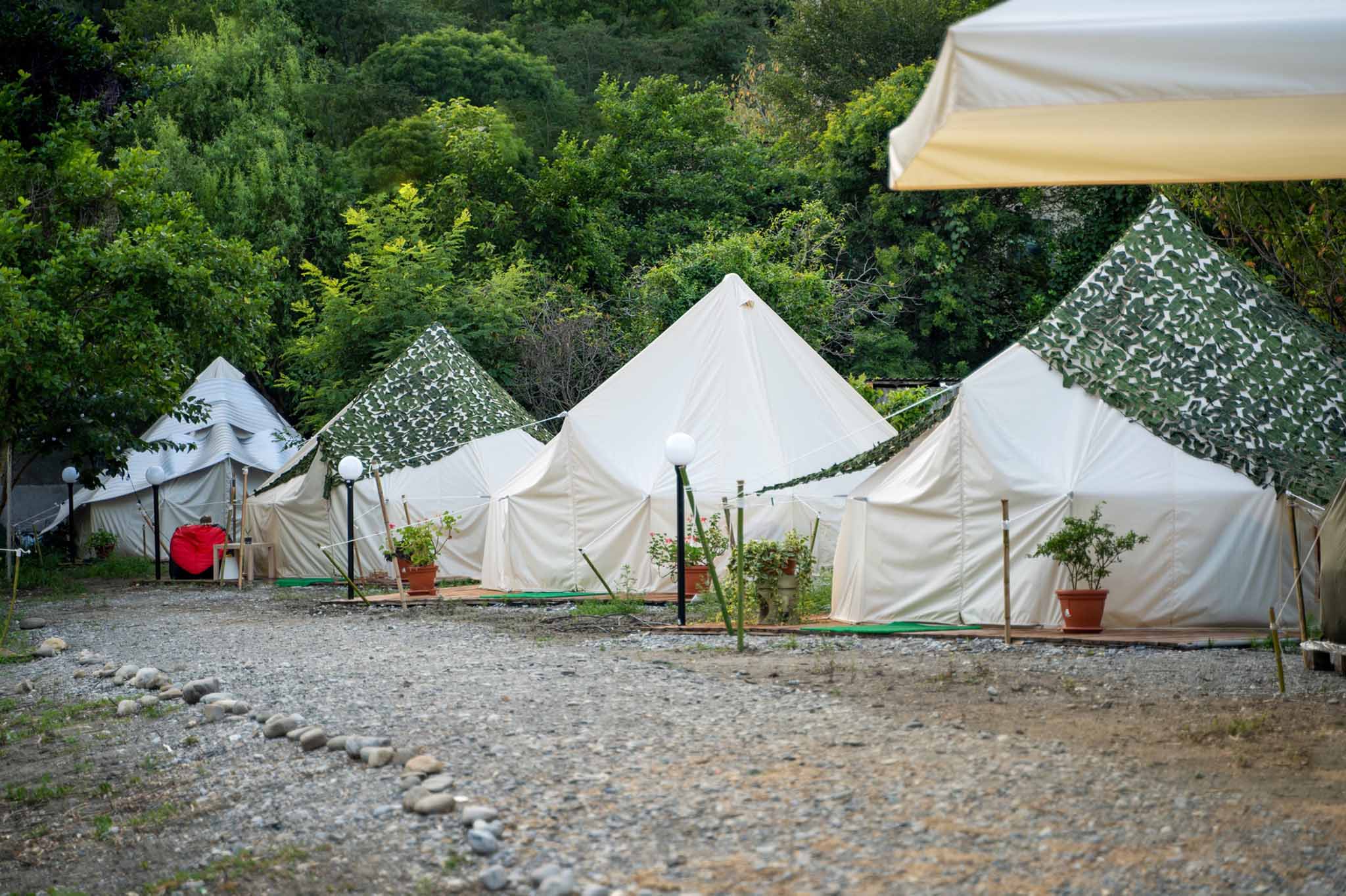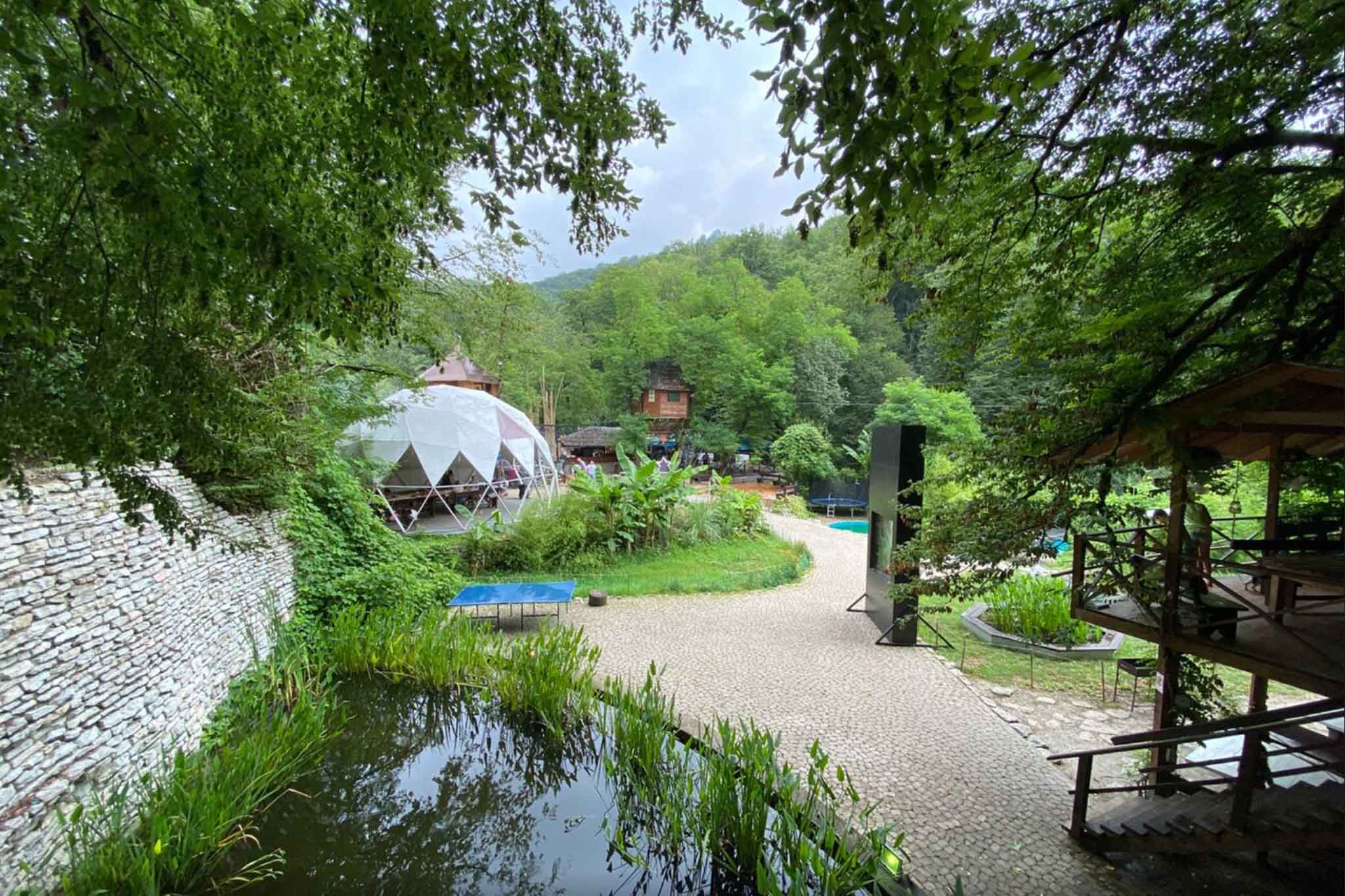 Территория палаточного лагеря с шатрами и белл-тентами раскинулась между двух прудов. В каждом жилье есть освещение, кровати и W-Fi. Душевые кабинки и туалеты находятся в отдельном хозяйственном блоке. Элементы декора и мебель изготовлены из деревьев, которые растут в соседнем лесу. Туристы оставляют хорошие отзывы о необычной крытой беседке с очагом и баре, в котором подают блюда кавказской кухни и отличное вино. До города Сочи 30 минут езды, а до железнодорожной станции Хоста ходит автобус №127.