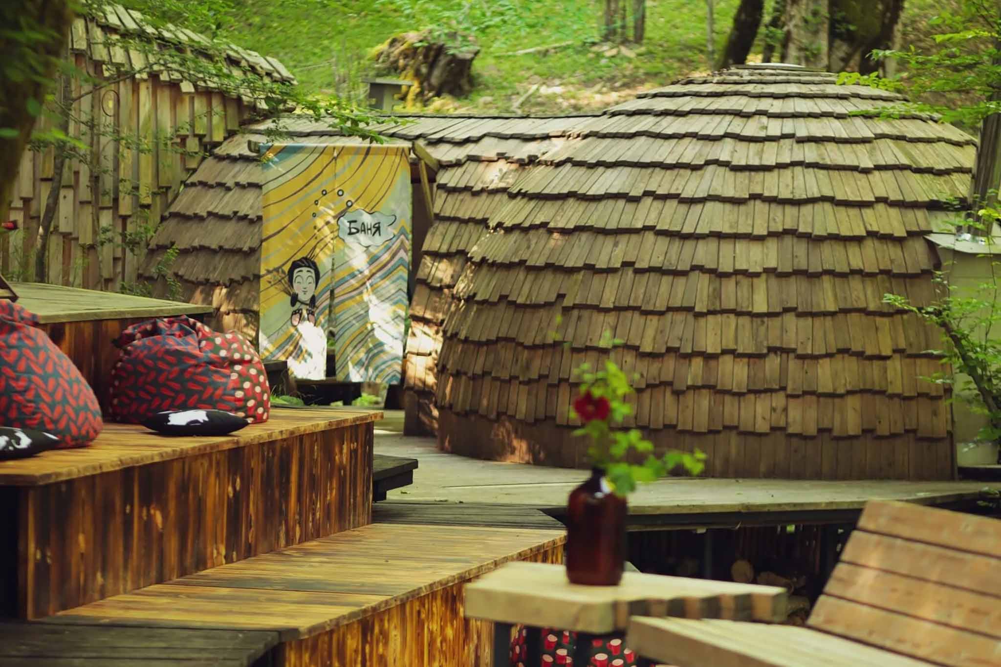 Эко-глэмпинг среди лесов и холмов между Красной Поляной и поселком Сириус придуман для творческих людей, бесстрашных путешественников и тех, кто обожает коворкинг на природе. К услугам гостей — 5 больших шатров на настилах, общие туалеты и души, зона для барбекю, терраса, гамаки, качели, мангал и купольная баня с травяными отварами.