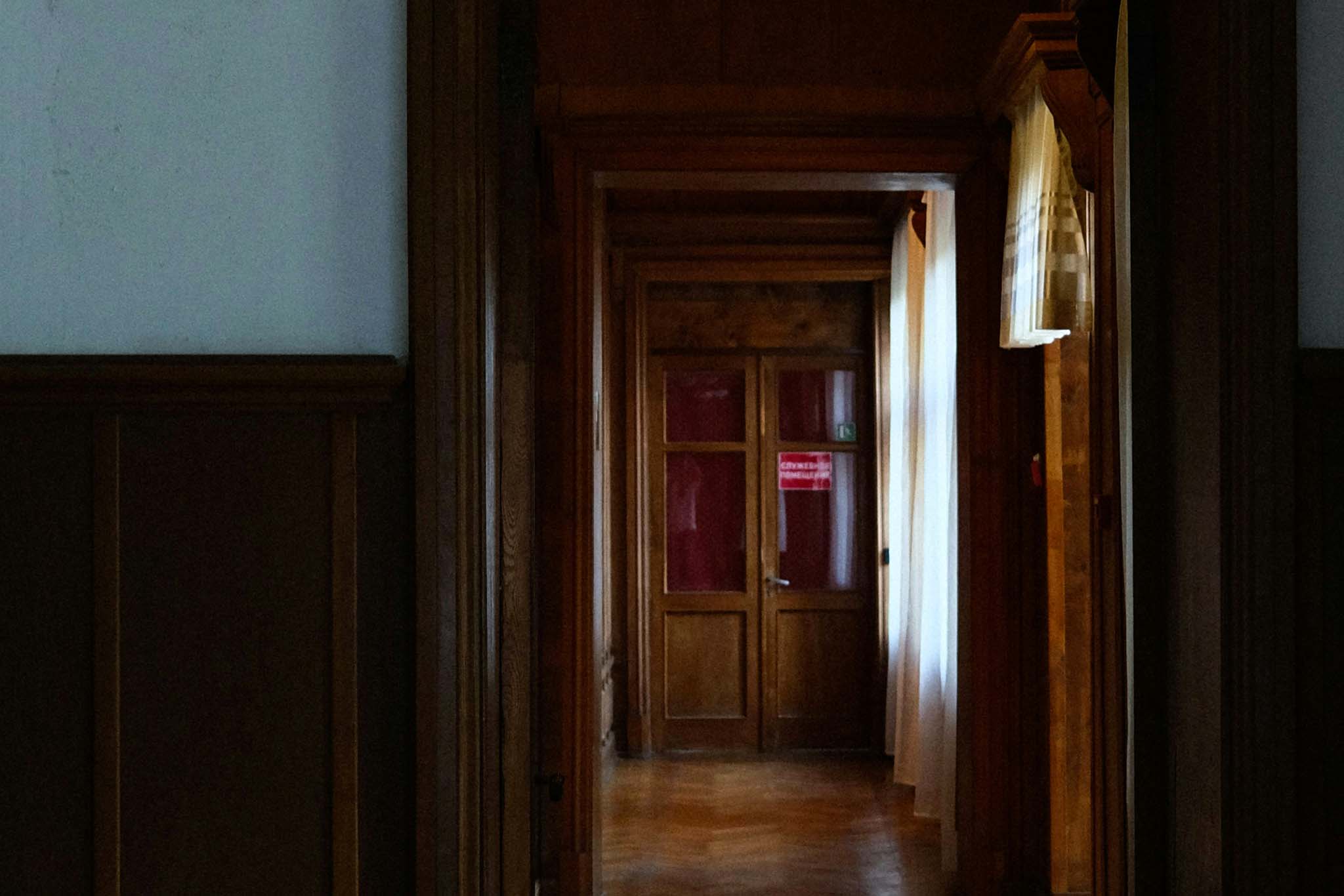 У стены напротив входа стоит большой кожаный диван, изготовленный специально для генсека. Над ним видны окошки для проектора — единственное, что напоминает об изначальном назначении этого зала.