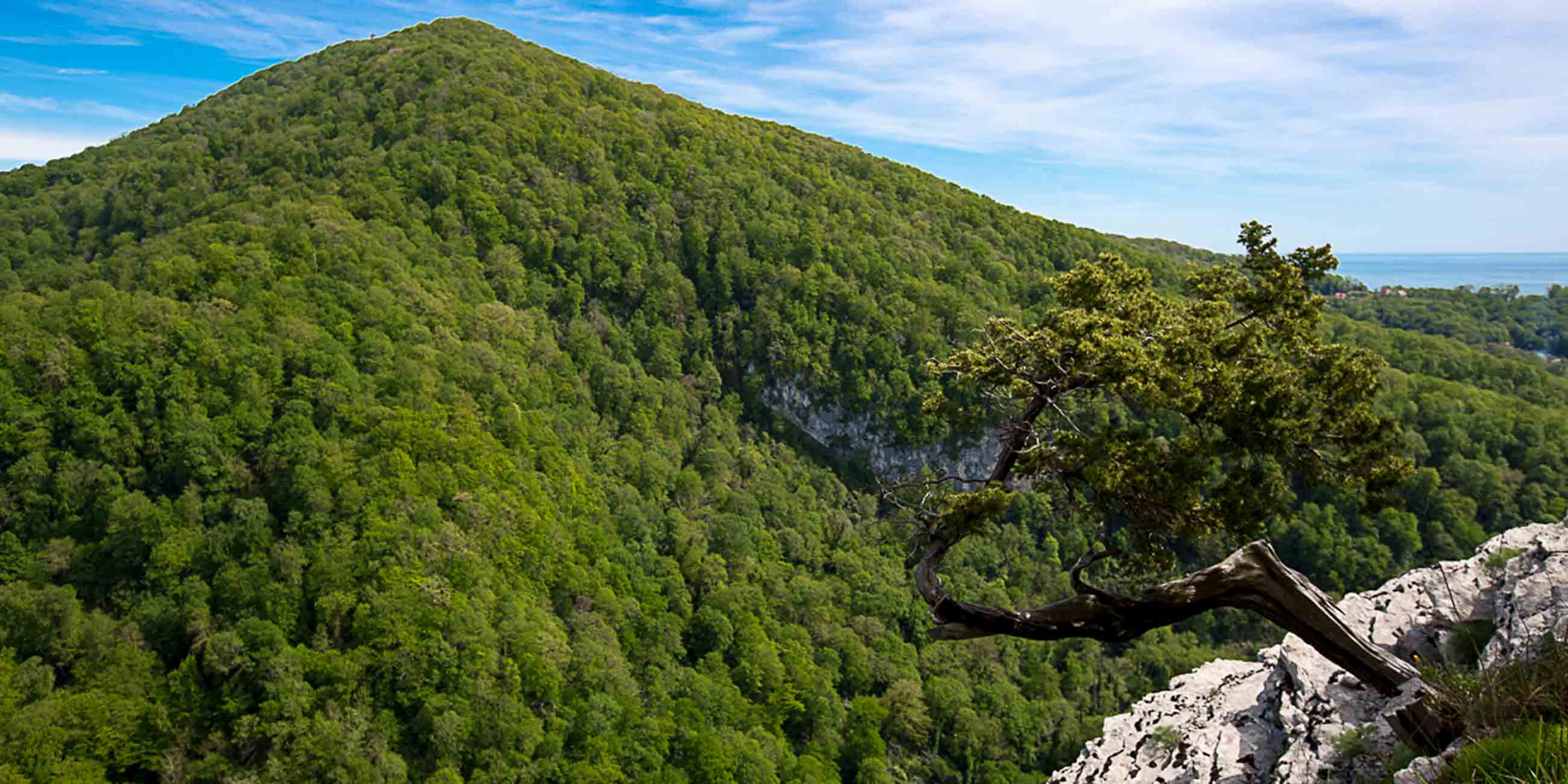 Сверху открываются великолепные виды на покрытую лесом долину реки Агур и окружающие горы. Как на ладони видны Чугуш, Ачишхо, Псеашхо, Сахарная голова и хребет Аибга высотой 2462 м.