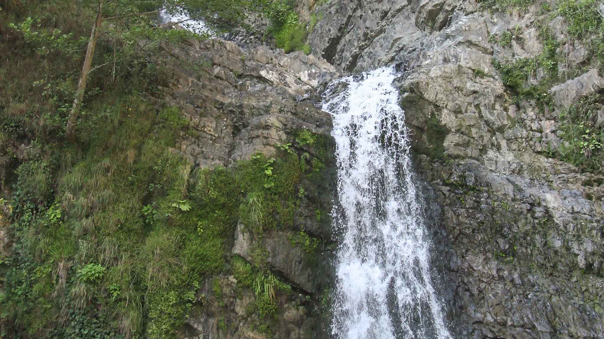 Первый, или Нижний водопад — двойной. Шумный поток воды срывается с высоты 10 м. В чашу под водопадом можно окунуться, но даже в жару прозрачная горная вода весьма прохладная — +13…+14°С. Рядом стоят раздевалки, работает кафе, оборудованы сиденья, беседки, расставлены урны.