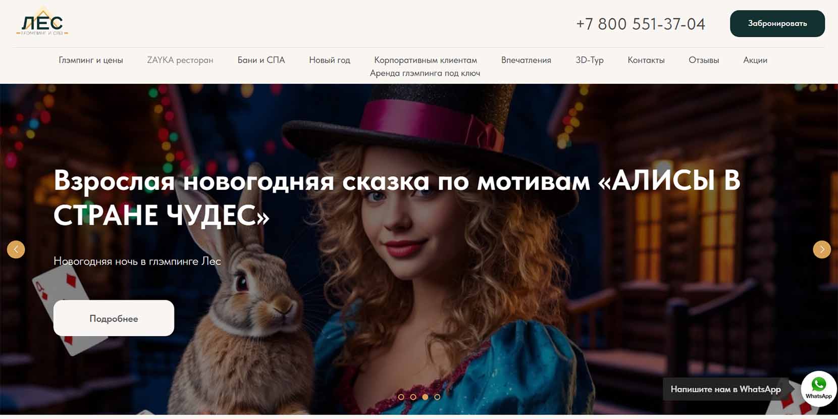 Ресторан в глемпинге «Лес» отмечает новый год в стиле «Алисы в стране чудес». Он расположен в уникальном месте вблизи Сочинского заповедника. Шеф-повар создал к празднику неповторимое меню из блюд, приготовленных из местных продуктов. Гостям также приготовили развлекательную программу, танцы и розыгрыши с ведущим и главными героями Новогодней ночи, Дедом Морозом и Снегурочкой.