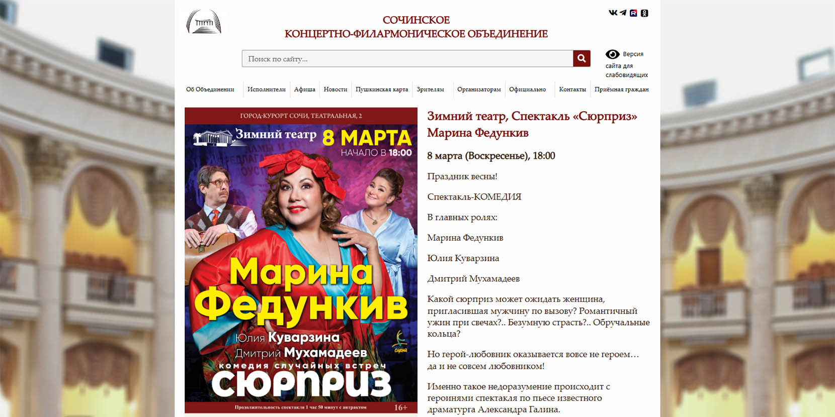Сочинской афише в начале марта может позавидовать любой российский город. В Международный женский день на популярный курорт приезжают именитые исполнители, музыканты и певцы. Есть, куда отправиться за праздничным настроением!