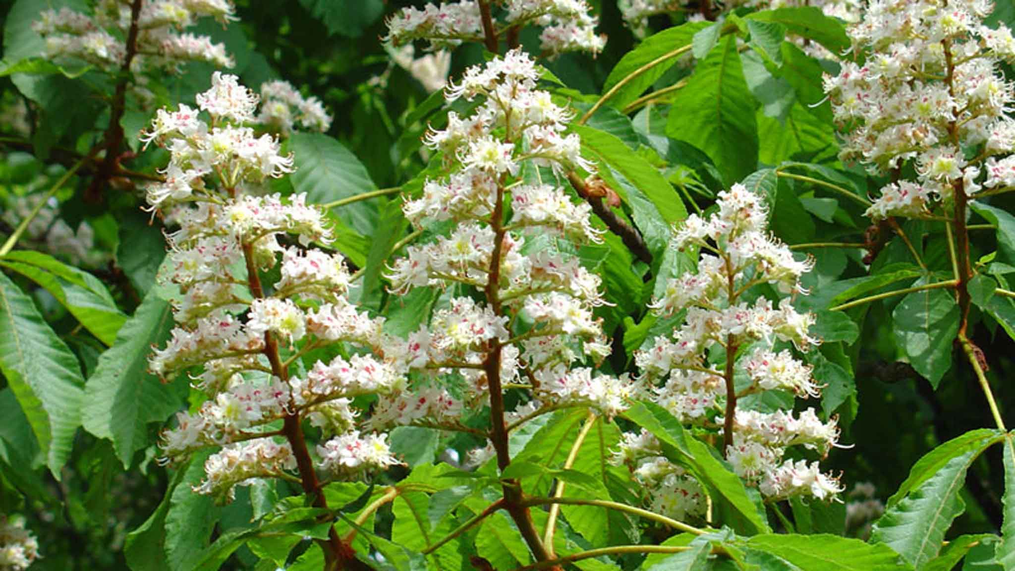 Как опознать: красиво цветущее декоративное дерево высотой до 30 метров. Листья из 5-7 сложных «пальцев». Белые цветки собраны в прямостоячие пирамидальные кисти.