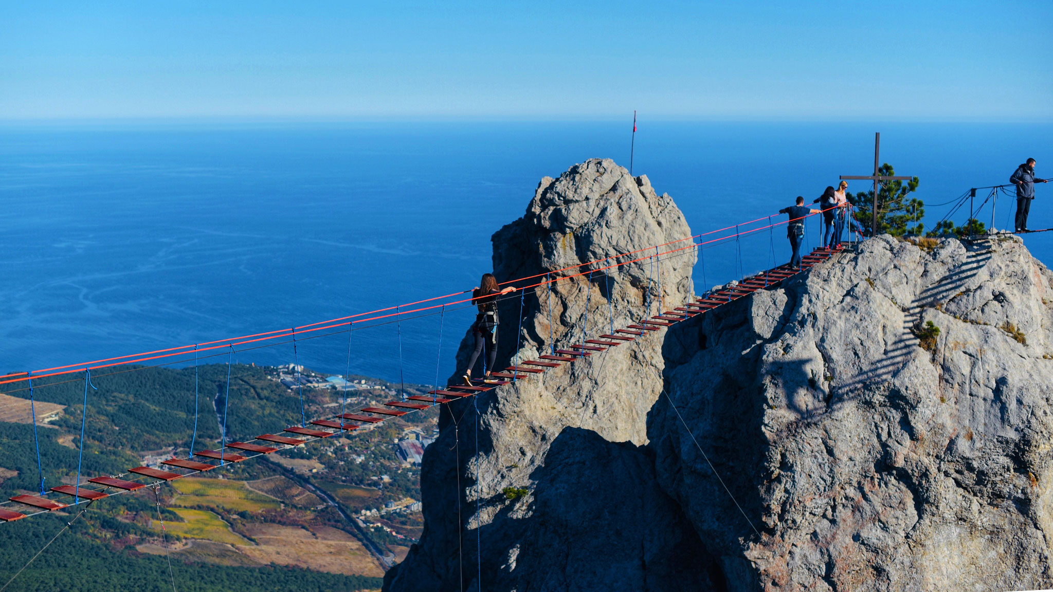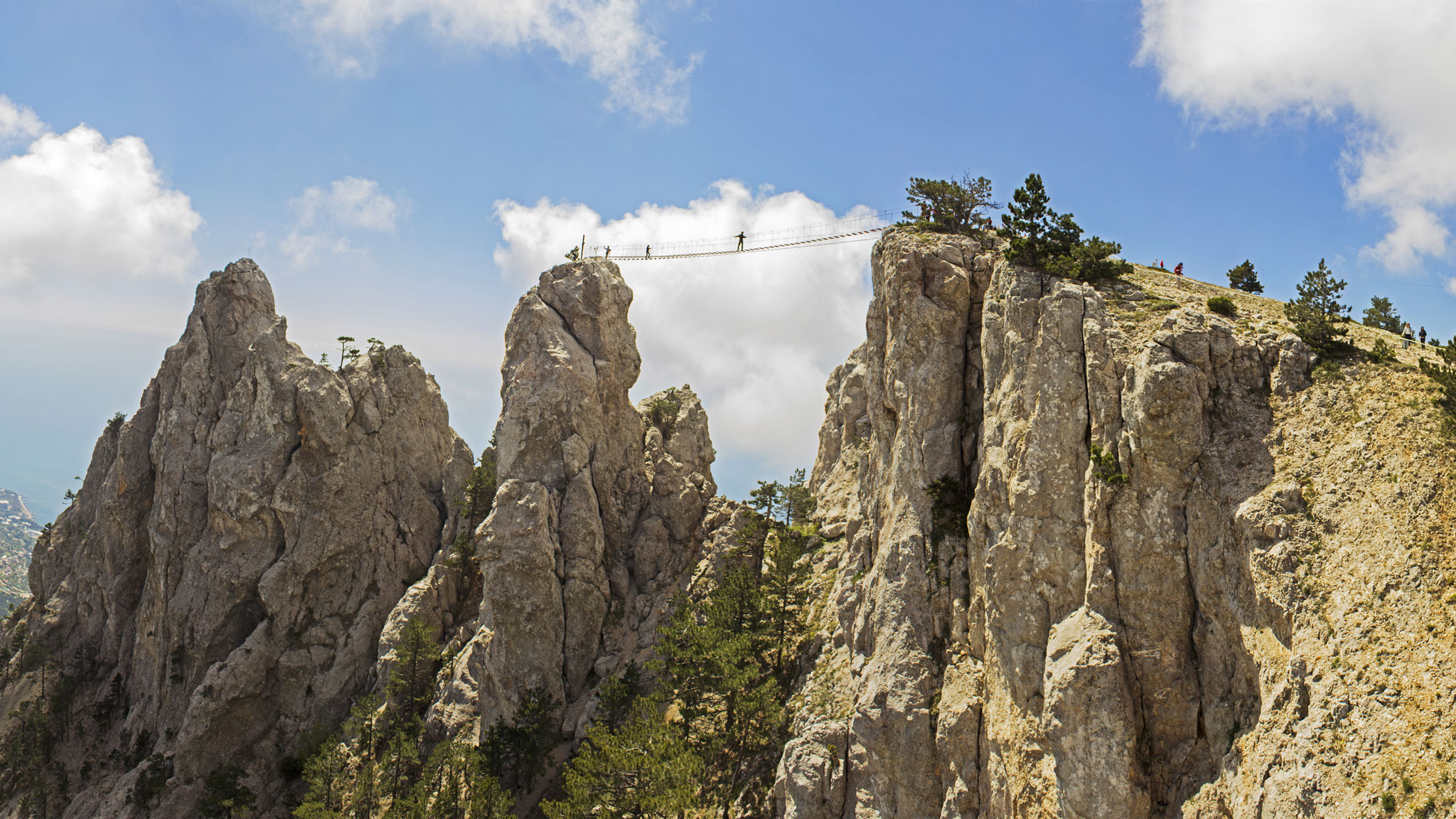Только представьте: пошатывающийся мост между скал, под вами пропасть больше тысячи метров, даже облака ниже вашей дорожки. Подвесной мост на Ай-Петри — это экстремально и завораживающе красиво. У вас будет страховка и инструкция, как передвигаться, так что меры безопасности соблюдены.