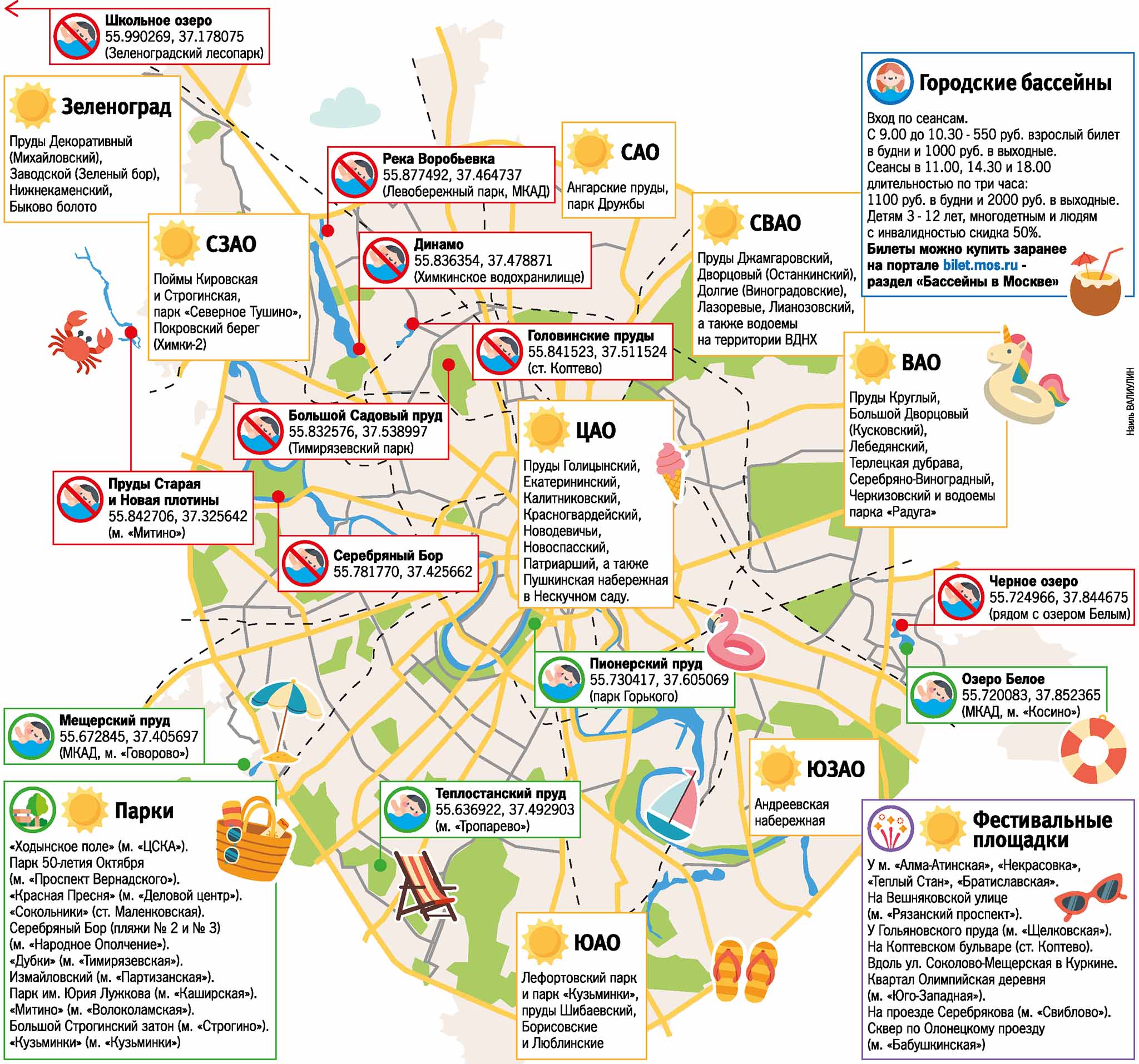 Пока официально разрешено купание в 4 местах — озеро Белое, Мещерское, Теплостанский пруд («Тропарево») и Пионерский пруд. В этих водоемах претензий к качеству воды у контролирующих органов нет. Как зоны отдыха (без купания) работают пляж «Динамо», Головинские пруды, «Левобережье», Большой Садовый пруд, Серебряный бор-2 и 3, озеро «Черное» и Школьное.