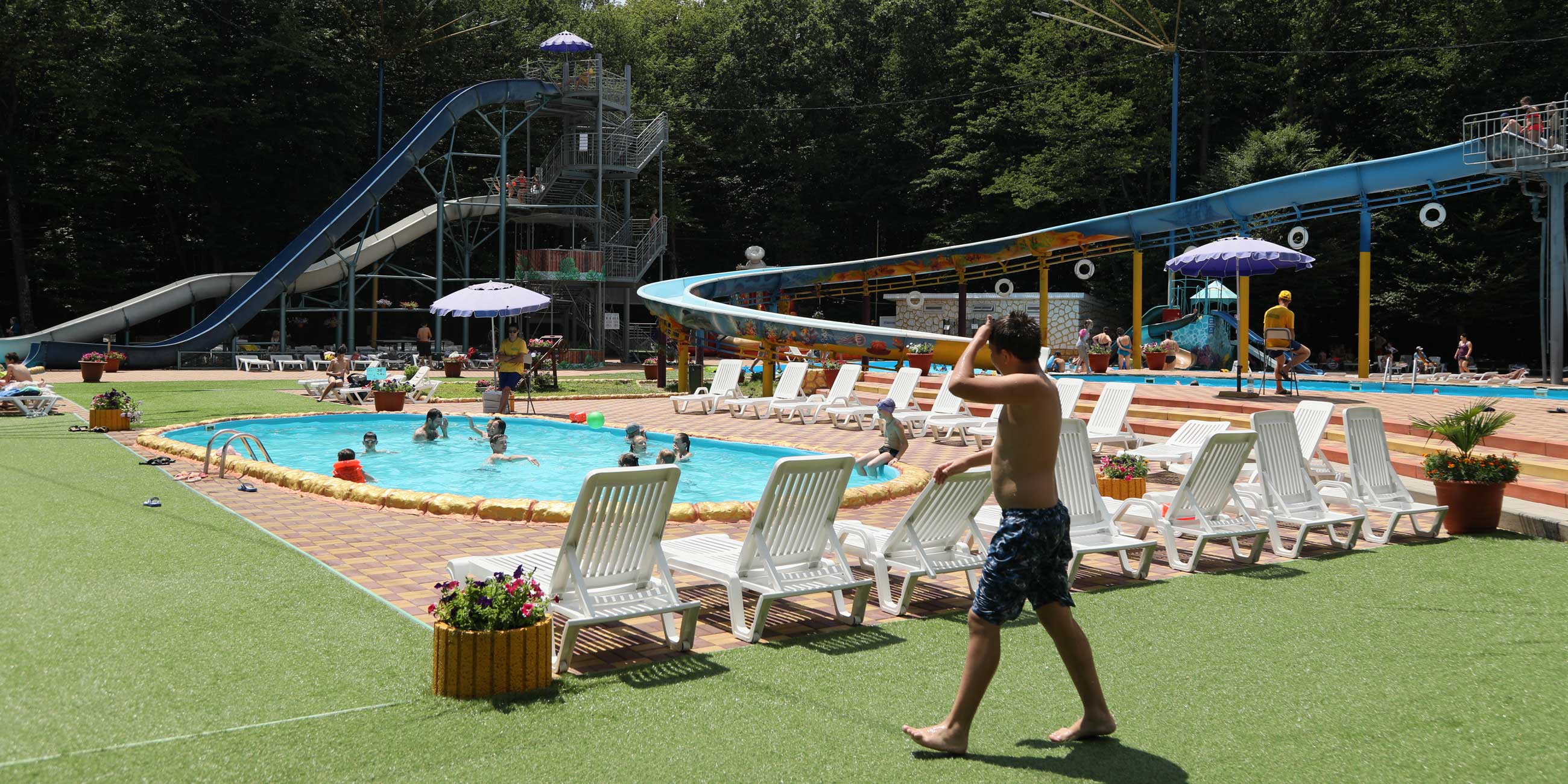 Благодаря гармоничному зонированию в аквапарке можно отдыхать целый день без вреда для здоровья. Здесь есть несколько водных горок, кафе, шезлонги, душевые и раздевалки.