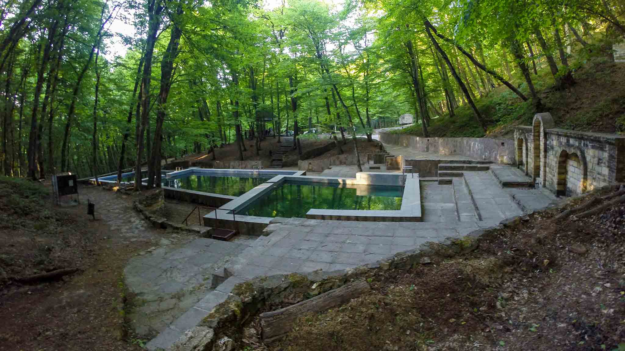 Внутри травертинового пласта есть две пещеры. Одна из них неглубокая, но если войти внутрь, на потолке можно рассмотреть небольшие сталактиты. Правда, зайти в эту пещеру можно только промокнув. Другая пещера сухая, но вода в ней оставила следы натеков. Здесь можно сфотографироваться на память. Зимой травертиновый источник замерзает и превращается в обледеневший водопад.