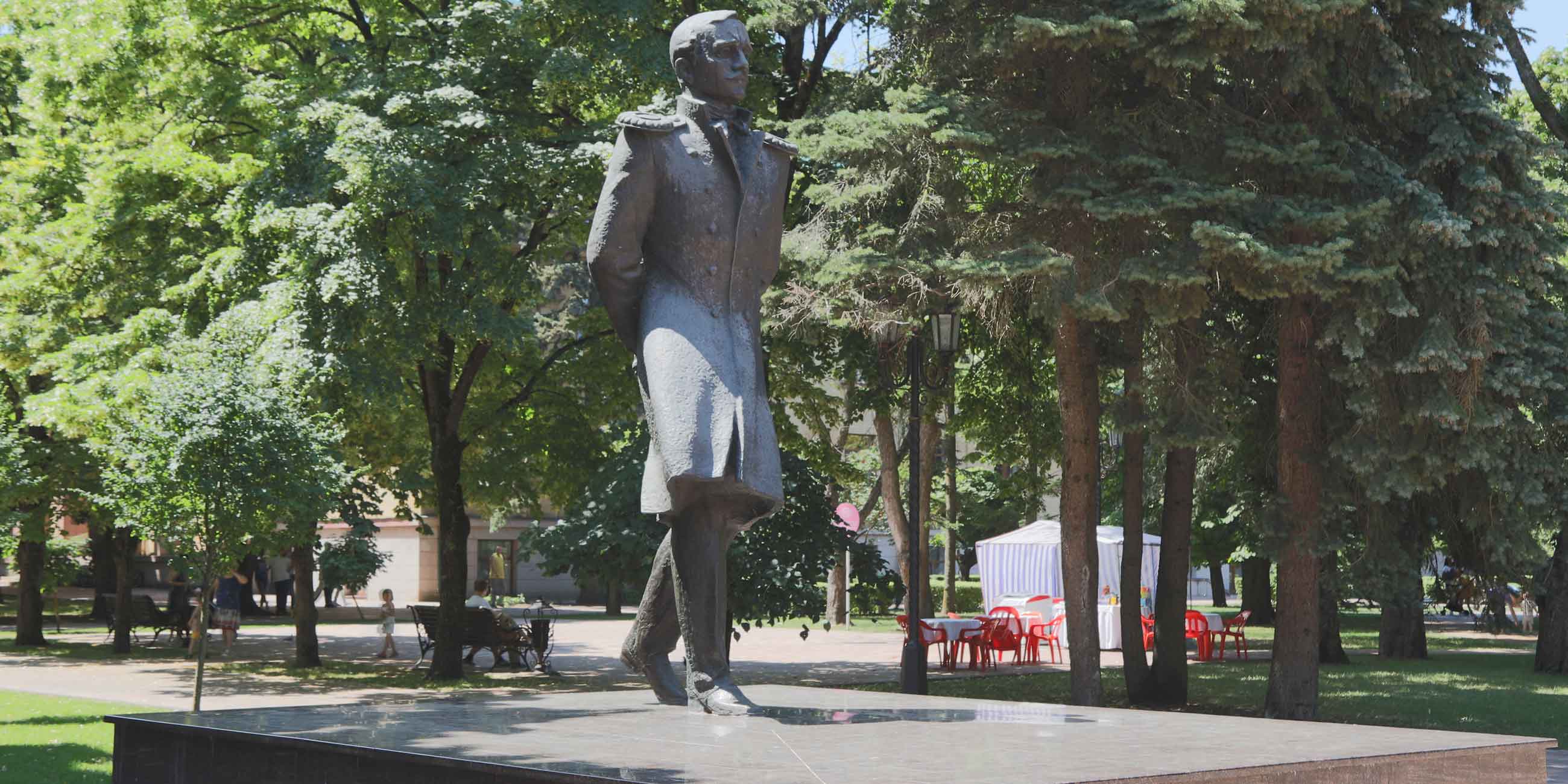 После того как вы сфотографируетесь на фоне Ставропольского театра драмы, попозируйте напротив розового здания через дорогу. За цвет и декоративные элементы его называют «зефирным». Потом обойдите театр и идите на аллею. За фонтаном с фигурными клумбами вы увидите 4-метровую бронзовую статую Михаила Лермонтова. Кстати, ставропольский памятник поэту туристы признают одним из самых удачных в стране.