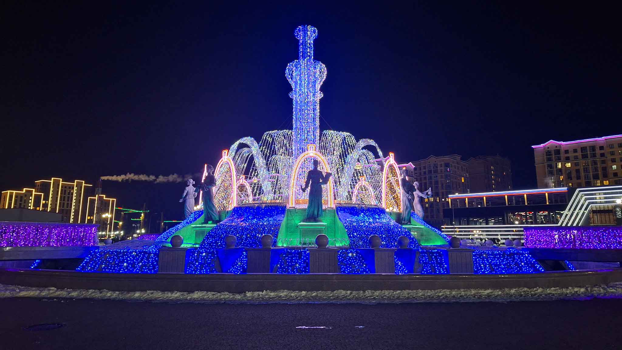 На Новый год на проспекте Октябрьской Революции загораются цветочные арки и протянутый над аллеей «Тоннель желаний». Переливается в свете гирлянд театральный сквер с разноцветными декоративными деревцами и подсвеченным фонтаном.