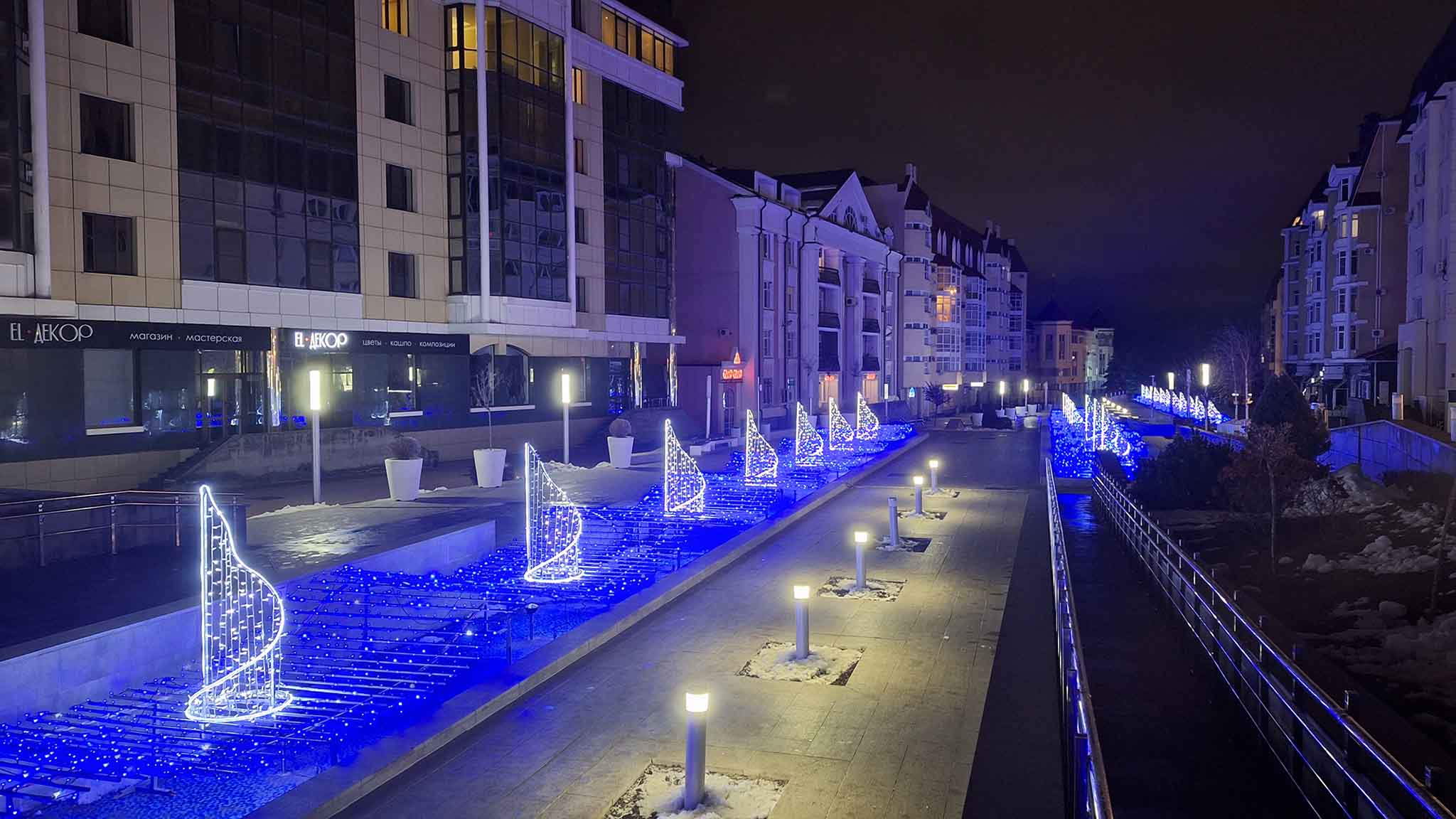 На улицах Маршала Жукова и Артема сияют три десятка светодиодных консолей в форме звезды, а перед Дворцом культуры и спорта красуется украшенная восьмиметровая новогодняя елка. На Александровской площади озаряется неоном каскад фонтанов у подножия стелы «Ангел» и мерцает ковер из лампочек «Звездное небо».