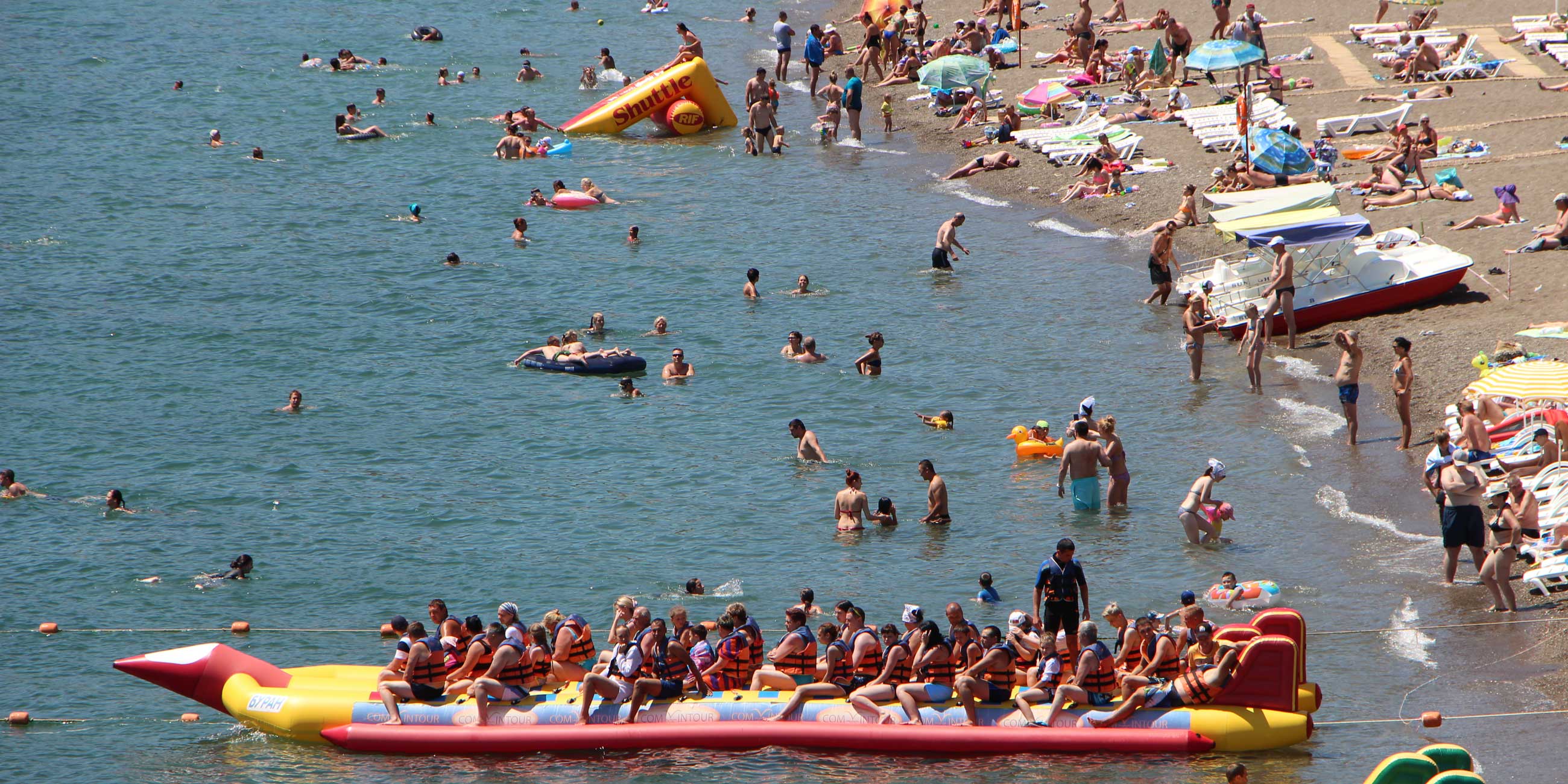 А совсем рядом с пляжем находится аквапарк, и многие семьи совмещают посещение пляжа с водными аттракционами.